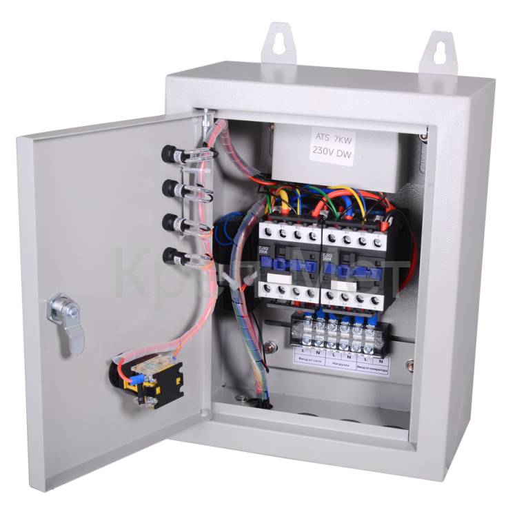 Система оснащена 2 контакторами с номинальным током 25 А, что гарантирует стабильное и надёжное переключение между основной сетью и генератором. Такая конфигурация позволяет эффективно управлять подачей электроэнергии как от резервного источника, так и от центральной сети, обеспечивая бесперебойную работу всей системы. Максимальная мощность до 10 000 Вт подходит для большинства бытовых и коммерческих генераторов.