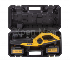 Пила работает от аккумулятора напряжением 20 В и емкостью 4 Ач, который питает электродвигатель. Двигатель передает усилие через редуктор на ведущую звездочку, приводя в движение пильную цепь. Во время работы цепь с 45 заточенными звеньями плавно режет материал. Скорость движения цепи составляет 9,5 м/с, гарантируя высокую производительность при распиле древесины и других материалов.