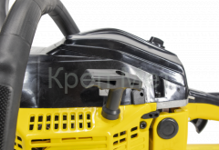 Движение пильной цепи обеспечивается за счет работы 2-тактного бензинового двигателя с плавным пуском. Воздушное охлаждение минимизирует риск перегрева. В топливный бак вмещается 550 мл бензо-масляной смеси, что гарантирует продолжительную эксплуатацию бензопилы без дозаправки. Пильная цепь состоит из 72 звеньев толщиной 1,5 мм.