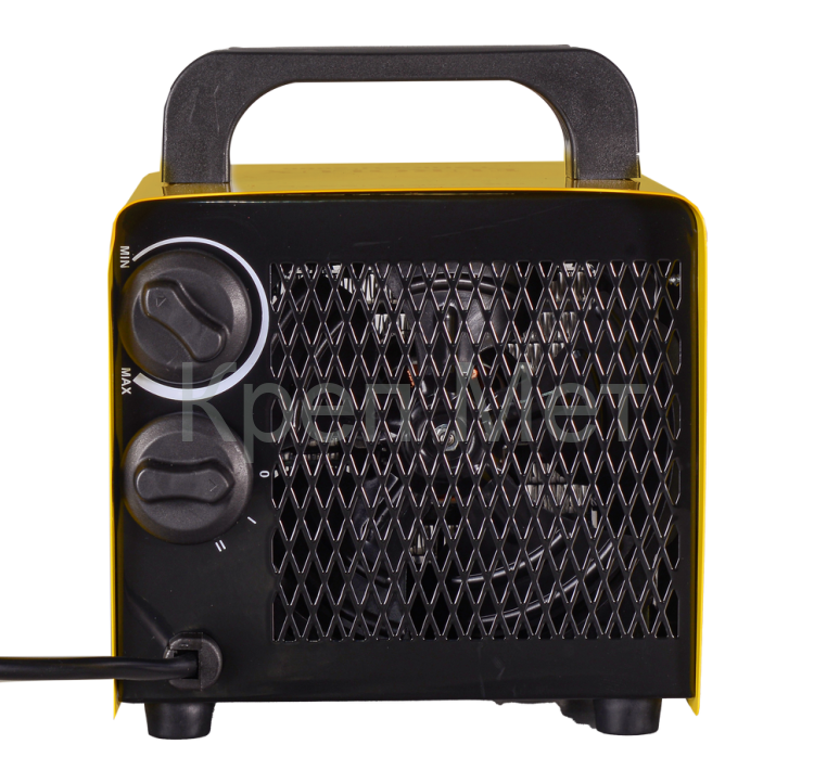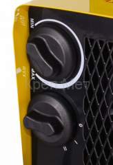 Электрическая тепловая пушка работает в 2 режимах мощностью 1 и 2 кВт. Это позволяет учитывать особенности помещения и экономить электроэнергию. Прибор может использоваться в качестве вентилятора без нагрева воздуха. Режим вентиляции позволяет охладить поверхность и улучшить воздухообмен. Механические регуляторы мощности и термостата вынесены на панель управления. С их помощью можно автоматически поддерживать выбранную температуру.
