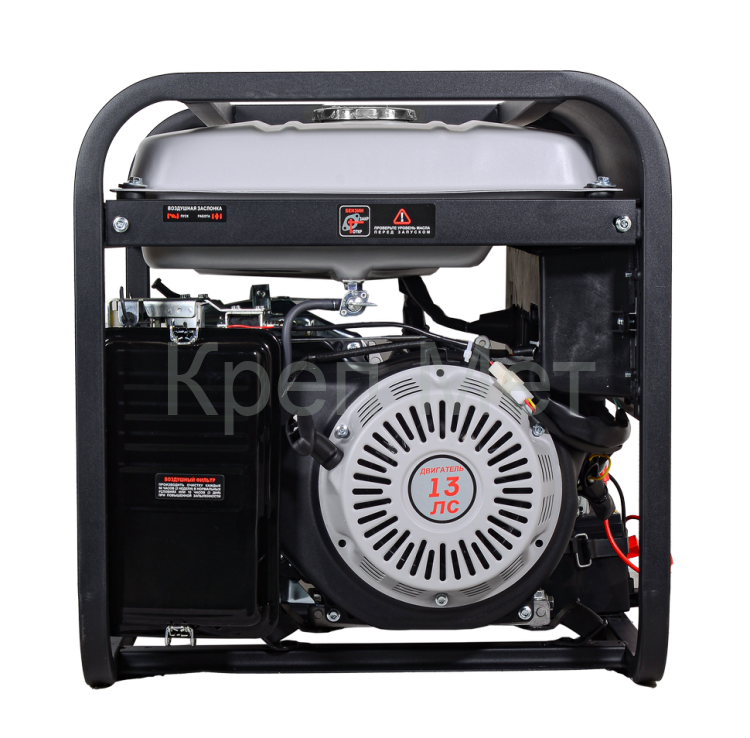 Номинальная мощность генератора составляет 5000 Вт с возможностью кратковременного увеличения до 5500 Вт, что позволяет одновременно подключать несколько электроприборов. Двигатель номинальной мощностью 13 л.с. сочетает высокую производительность с экономичностью, а вместительный топливный бак на 22 л обеспечивает продолжительную работу без дозаправки.