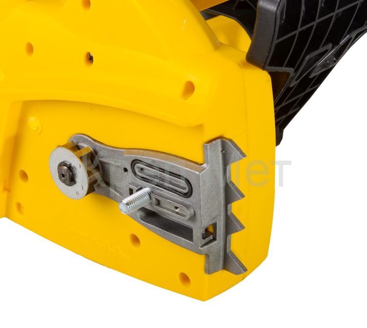 В основе конструкции — мощный щеточный двигатель на 2200 Вт с боковым расположением, которое делает инструмент компактнее и позволяет получить легкий доступ для замены щеток. Рабочий элемент — шина на 40 см с цепью из 57 звеньев. Толщина звена составляет 1,3 мм, а шаг цепи - 3/8". Обслуживание упрощено благодаря удобному механизму быстрой затяжки цепи и легкодоступным щеткам двигателя.