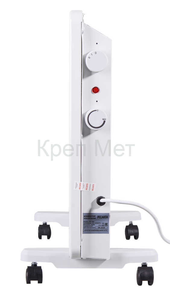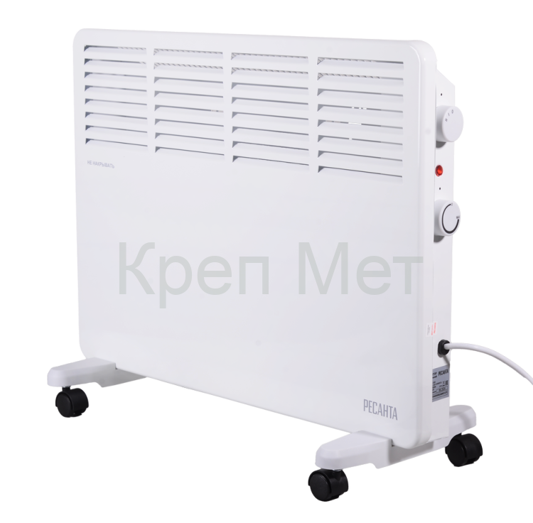 Конвектор РЕСАНТА ОК-1500 на опоре с колёсами устойчив и мобилен. Он дополнительно оснащён терморегулятором, защищающим устройство от перегрева. Данная модель – с механическим управлением.