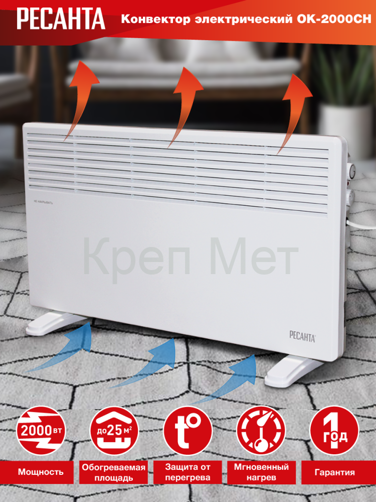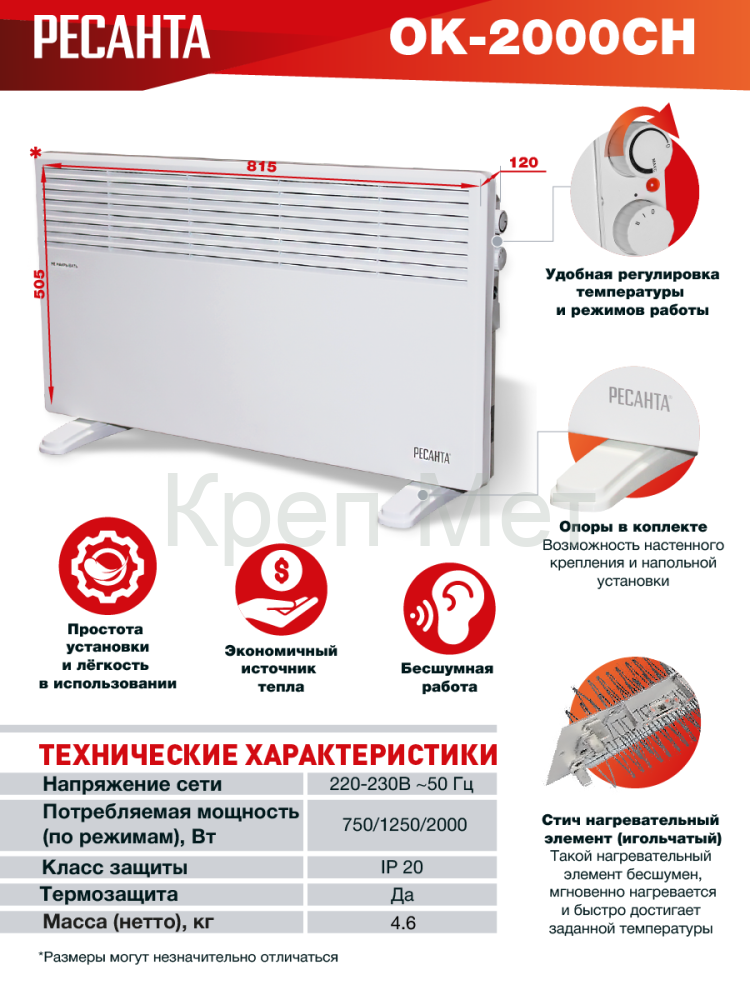 Высокоточный термостат в сочетании с удобным механическим управлением поддерживает заданную температуру. Конвектор имеет класс защиты от влаги IP 20. Для обеспечения пожарной безопасности предусмотрено автоматическое выключение при перегреве. Быстрое нагревание до заданной температуры и высокий КПД обеспечивают эффективную и экономичную работу.