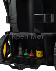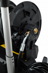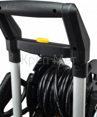 Мойка оборудована удобной ручкой и колесиками, что делает перемещение легким и комфортным. Длинный шланг 8 м убирается на специальный барабан, что упрощает его хранение.