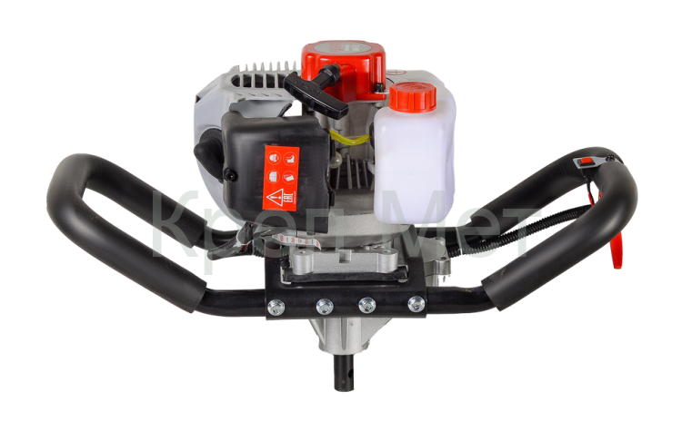 Конструкция мотобура представляет собой двигатель и топливный бак, помещенные в раму. Для удобства использования к раме крепят ручки. Посредством редуктора на выходной вал подается крутящий момент. Прикрепленный к нему шнек проделывает лунки. Есть шнеки различных диаметров для грунта и для льда. Шнек не входит в комплект, его нужно приобретать отдельно. То же касается и удлинителя.