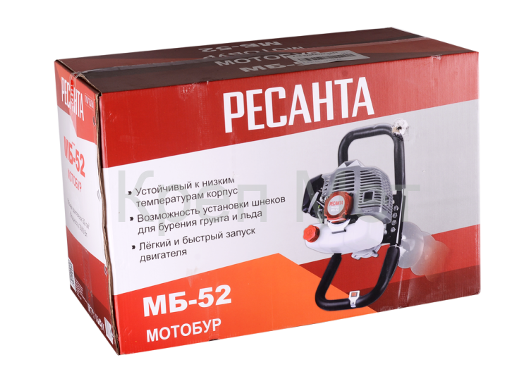 Ресанта МБ-52 имеет одноцилиндровый двухтактный двигатель объемом 52 см? и мощностью в 2 кВт. Этого достаточно для создания лунок глубиной до 2 м и шириной до 300 мм.