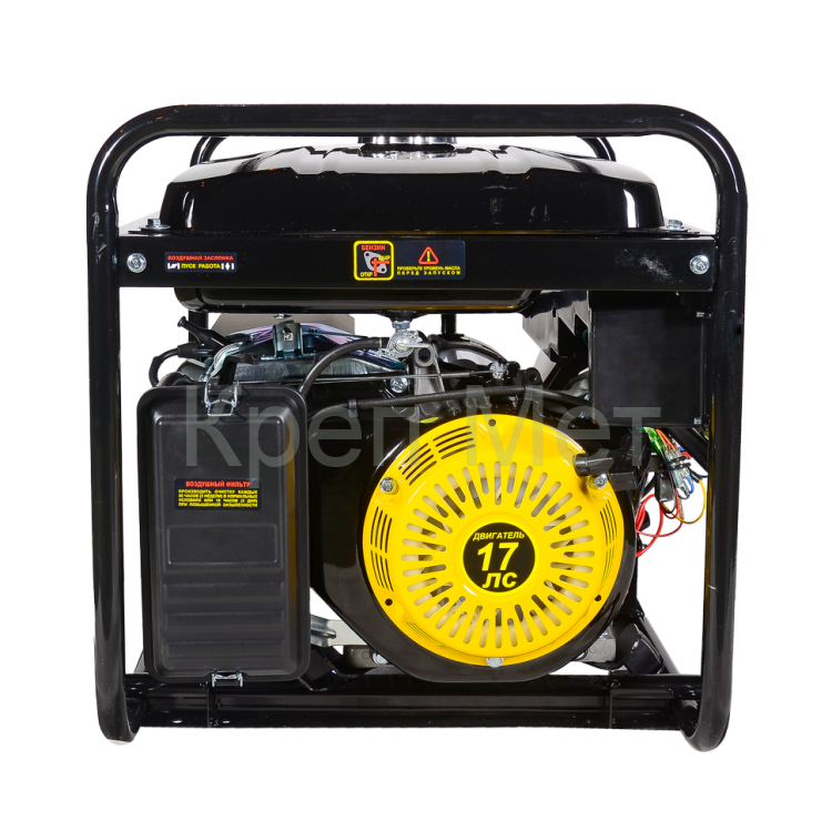 Он оснащен современным четырехтактным карбюраторным двигателем мощностью 17 л.с. Это позволяет устройству выдавать номинальную электрическую мощность 7500 Вт, а при необходимости справляться с пиковыми нагрузками до 8000 Вт.