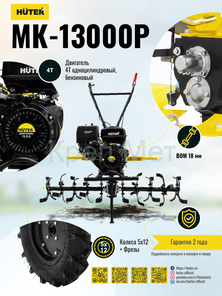 Мотоблок Huter MK-13000P — мощная машина тяжёлого класса, предназначенная для интенсивной эксплуатации на крупных территориях в фермерских и садоводческих хозяйствах.
