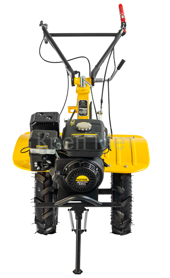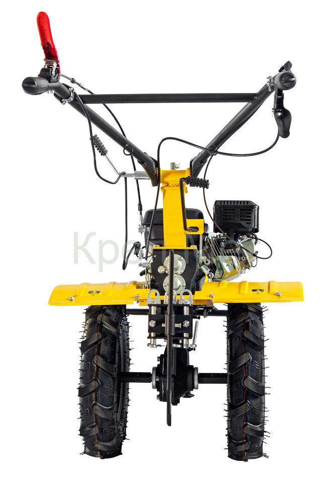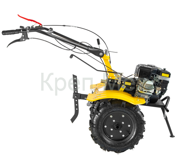Машина оснащена тремя скоростями передвижения: двумя передними и одной задней скоростью. Такая трансмиссия значительно облегчает процесс маневрирования и повышает эффективность работы. Широкие резино-металлические шины размером 4?10" с глубокими протекторами обеспечивают отличную проходимость даже на влажных и рыхлых землях, позволяя машине уверенно двигаться практически в любых условиях.