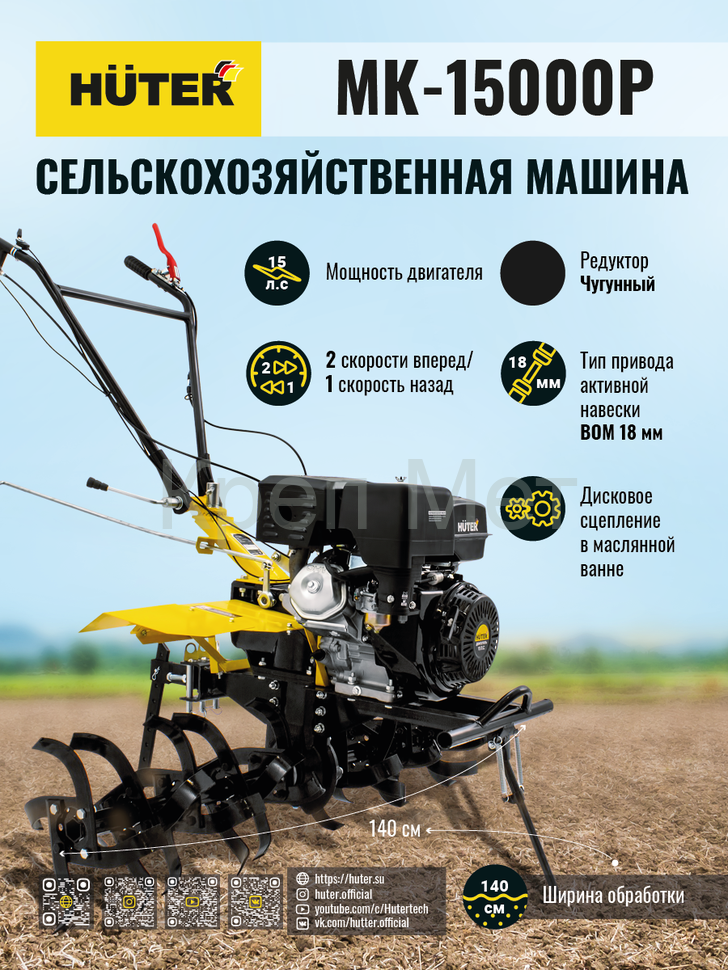 Мотоблок Huter MK-15000P предназначен для эффективного освоения значительных площадей земель. Эти машины характеризуются высокой производительностью и способностью длительное время функционировать совместно с разнообразным навесным оборудованием активного и пассивного типов.