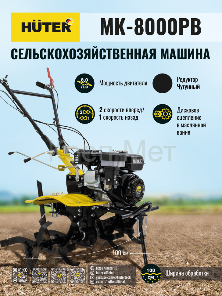 Мотоблок Huter МК-8000РВ представляет собой многофункциональную сельскохозяйственную технику средней мощности. В его основе лежит надёжный четырёхтактный бензиновый мотор с одним цилиндром, который запускается при помощи удобного ручного стартера.