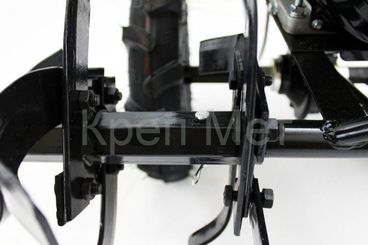 Передача мощности осуществляется через прочный чугунный редуктор с тремя скоростными режимами: двумя передними и одним задним. Ось позволяет монтировать как рабочие фрезы для обработки почвы, так и колёса с грунтозацепами для передвижения. Отсутствие вала отбора мощности ограничивает использование только пассивным навесным оборудованием и транспортными прицепами.