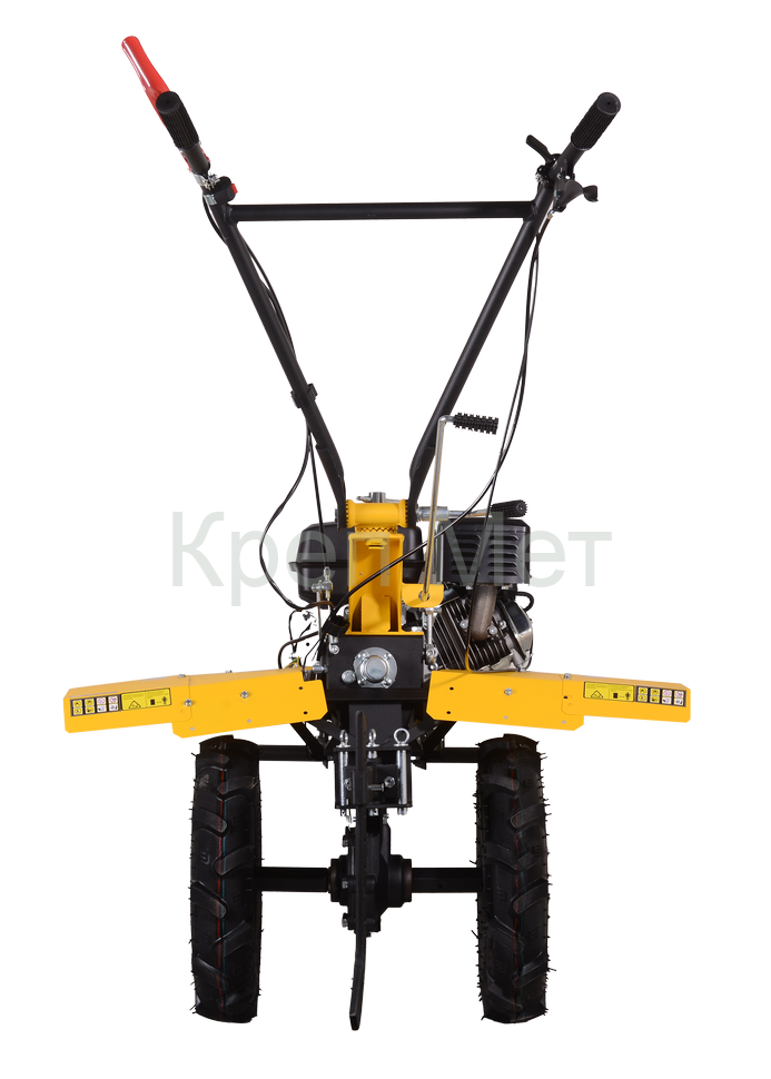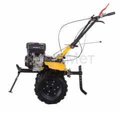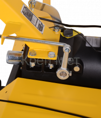 Мотоблок относится к машинам тяжелого класса, что позволяет без усилий справляться с обработкой почвы любой плотности и структуры. Профилированная шестигранная ось диаметром 32 мм, выдерживает значительные нагрузки. На нее крепятся фрезы, колеса или грунтозацепы. Закаленные фрезы диаметром 32 см позволяют за один проход захватить полосу 115 см. Убирая лишние сегменты фрез, можно уменьшить ширину прохода, если это необходимо.