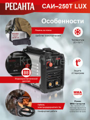САИ-250T LUX - предназначен для ручной дуговой сварки штучным покрытым электродом на постоянном токе и электродом с рутиловым и основным покрытием (режим ММА). Сварочные аппараты разработаны на базе IGBT транзисторов .