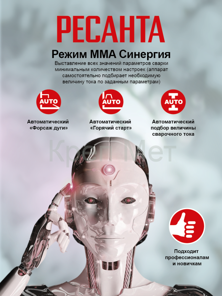 В режиме Синергии ММА, в зависимости от выбранного диаметра электрода и толщины металла, сила сварочного тока находится в оптимальном диапазоне, функции «форсаж дуги» и «горячий старт» подстраиваются автоматически.