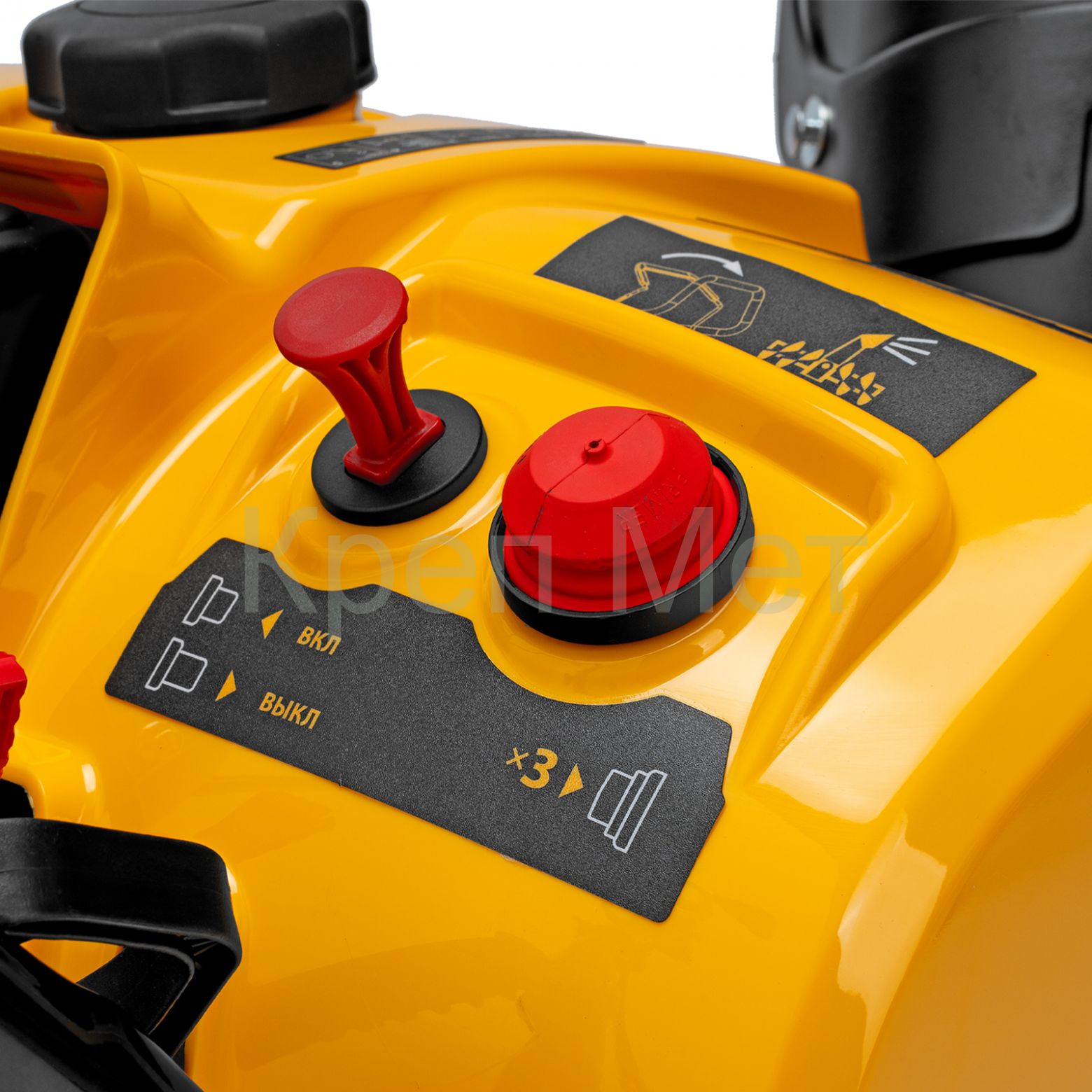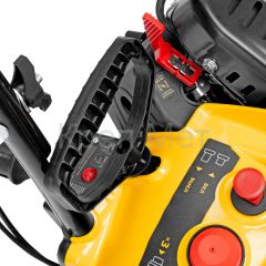 - Удобное управление — широкая рукоятка ручного старта облегчает запуск двигателя, для регулировки угла поворота желоба не нужно наклоняться.