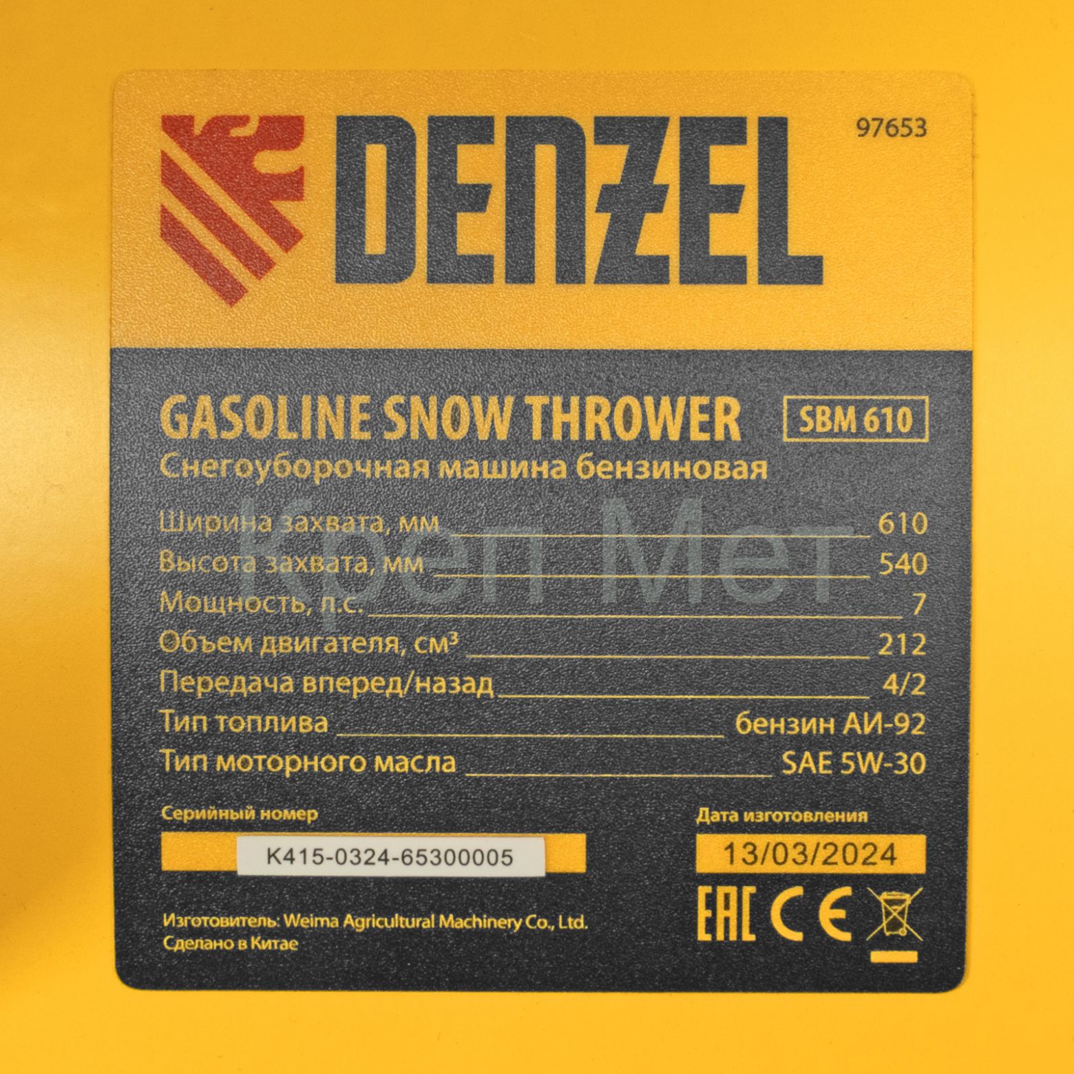 - Бензиновая снегоуборочная машина SBM 610, 212 cc, ручной старт, фара Denzel