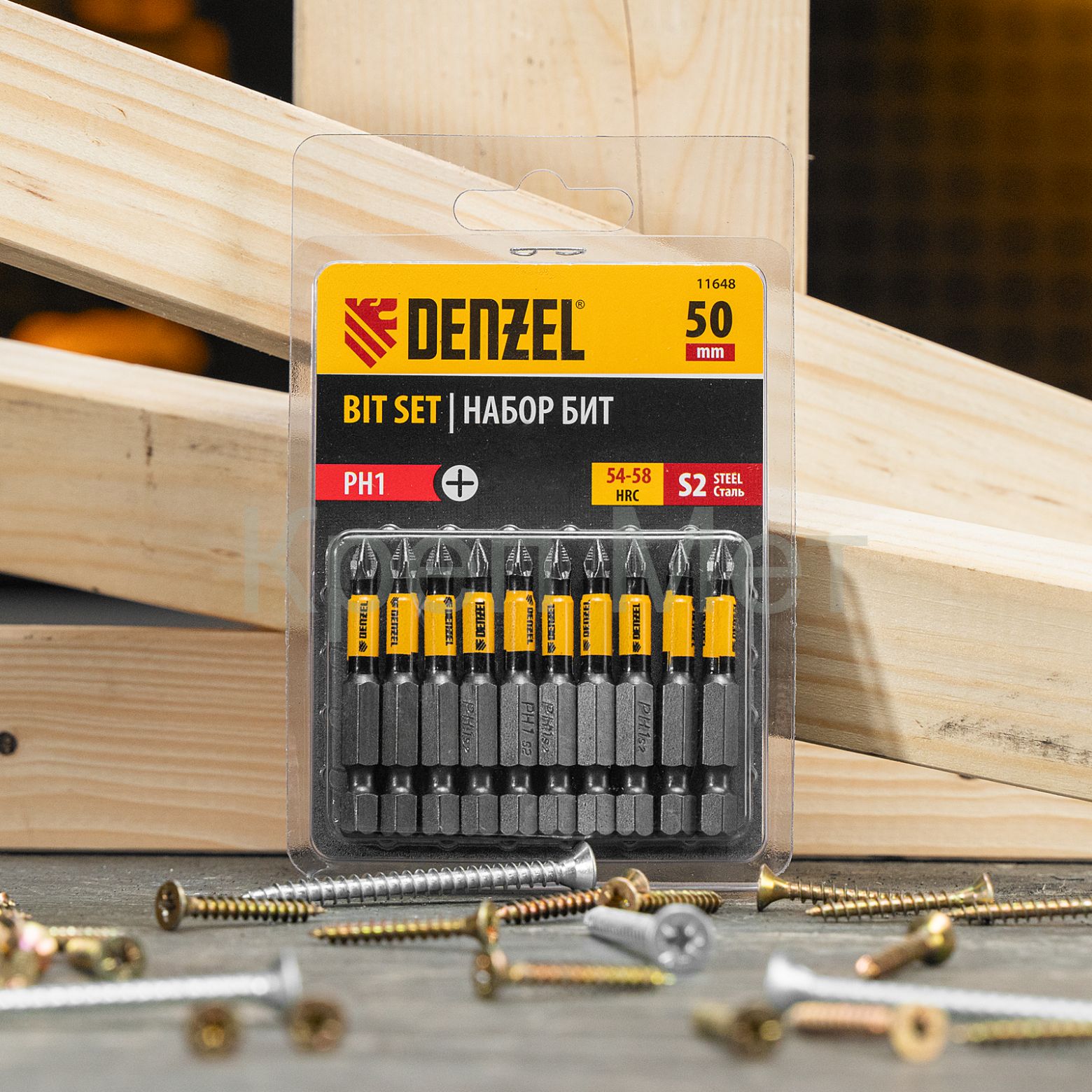- Защита от подделок — цветное кольцо с логотипом ТМ Denzel на каждой бите подтверждает оригинальность товара.