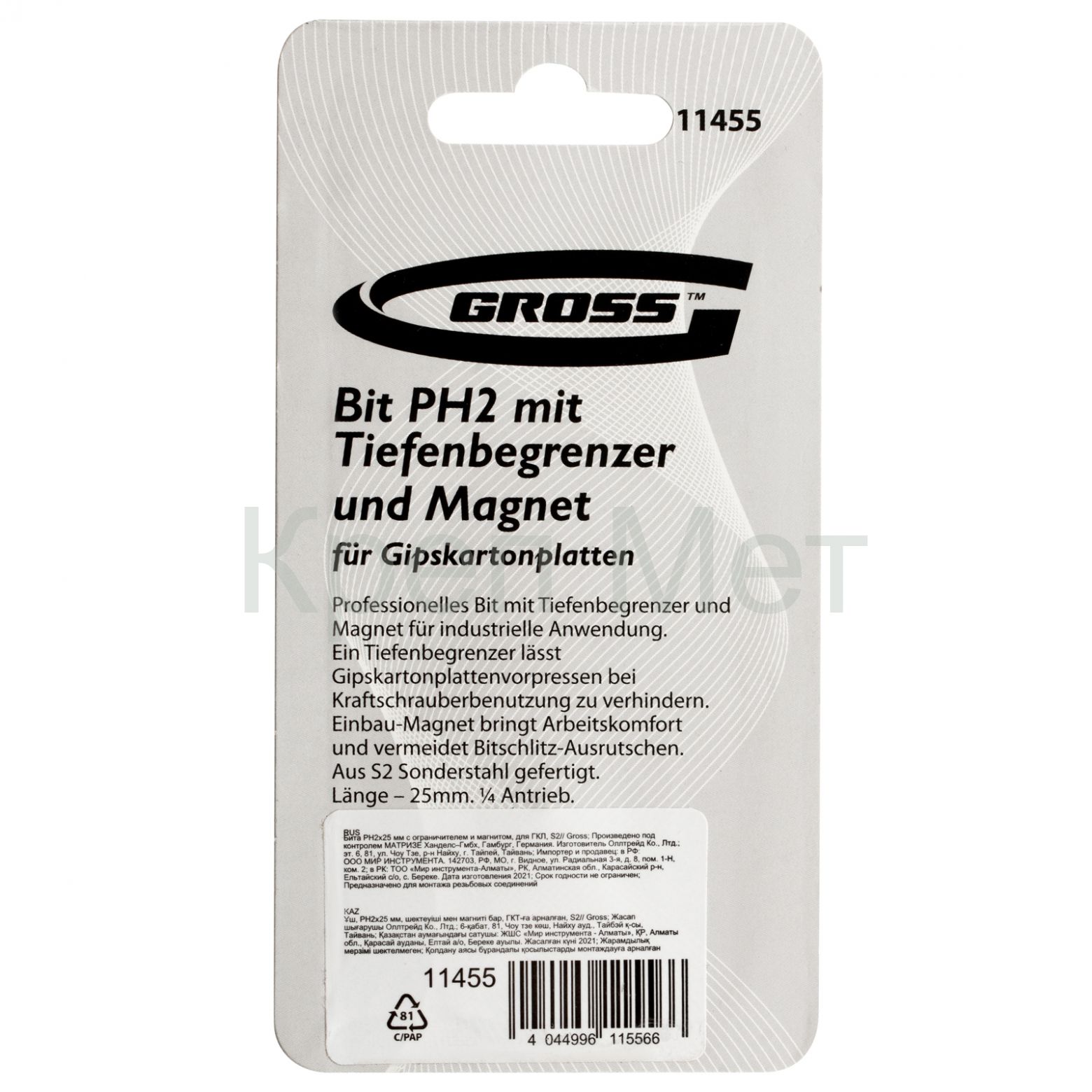 Бита Gross 11455 типоразмера PH2 x 25 мм, из стали S2, c ограничителем и магнитом, оптимально подходит для монтажа и демонтажа саморезов в гипсокартонные листы. Используется в качестве оснастки для шуруповертов и отверток. Благодаря встроенному ограничителю хода крепеж ввинчивается на необходимую глубину, что позволяет избежать повреждения материалов и экономит время мастера.