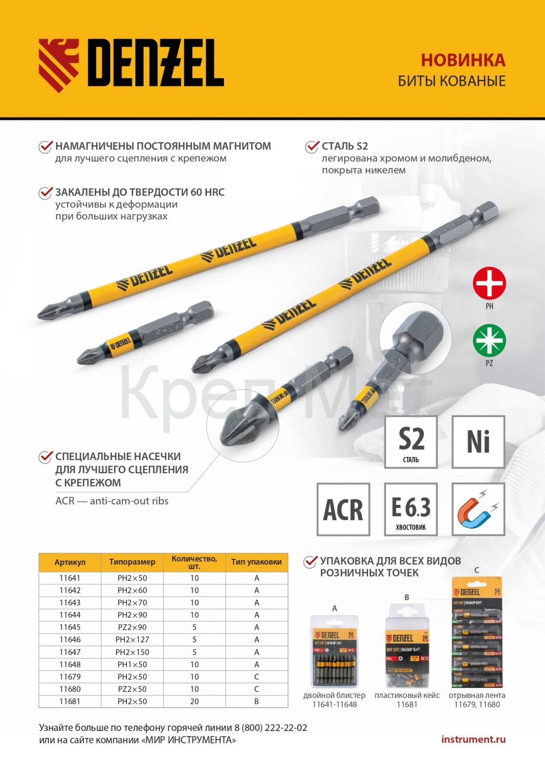 - Бита PH2х70, сталь S2, цилиндр., 10 шт. Е 6,3 Denzel