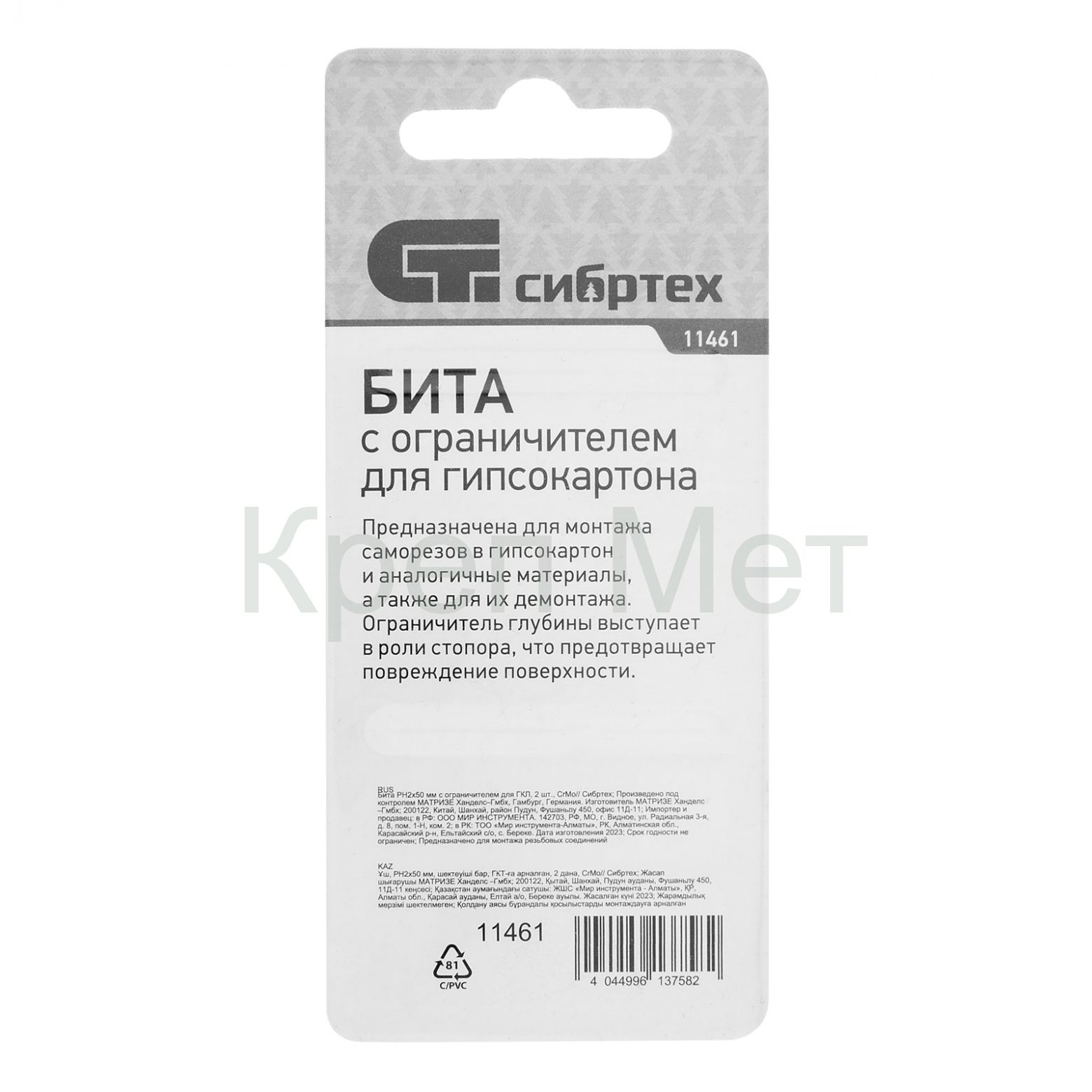 Бита для ГКЛ Сибртех 11461 из стали CrMo, типоразмера PH2 x 50 мм, с ограничителем, 2 шт. в уп., применяется в качестве оснастки для шуруповертов, реверсивных и электрических отверток. Она предназначена для монтажа гипсокартонных листов при помощи резьбовых крепежей с крестообразными шлицами. Благодаря ограничителю хода крепеж закручивается вровень с поверхностью ГКЛ.