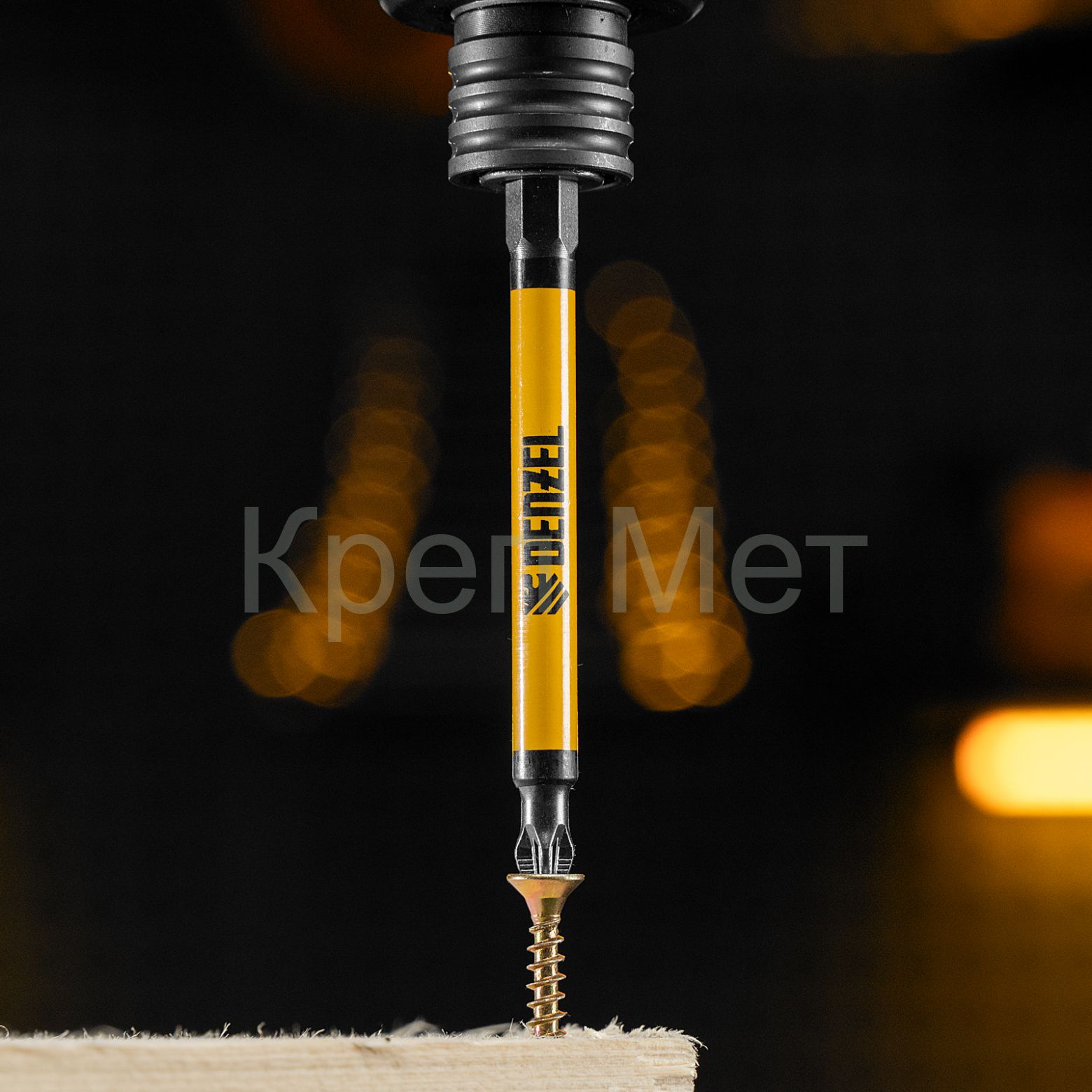 - Долговечность — насечки на шлице препятствуют проскальзыванию и «слизыванию» бит, дополнительно усиливают контроль при работе с саморезами по дереву.