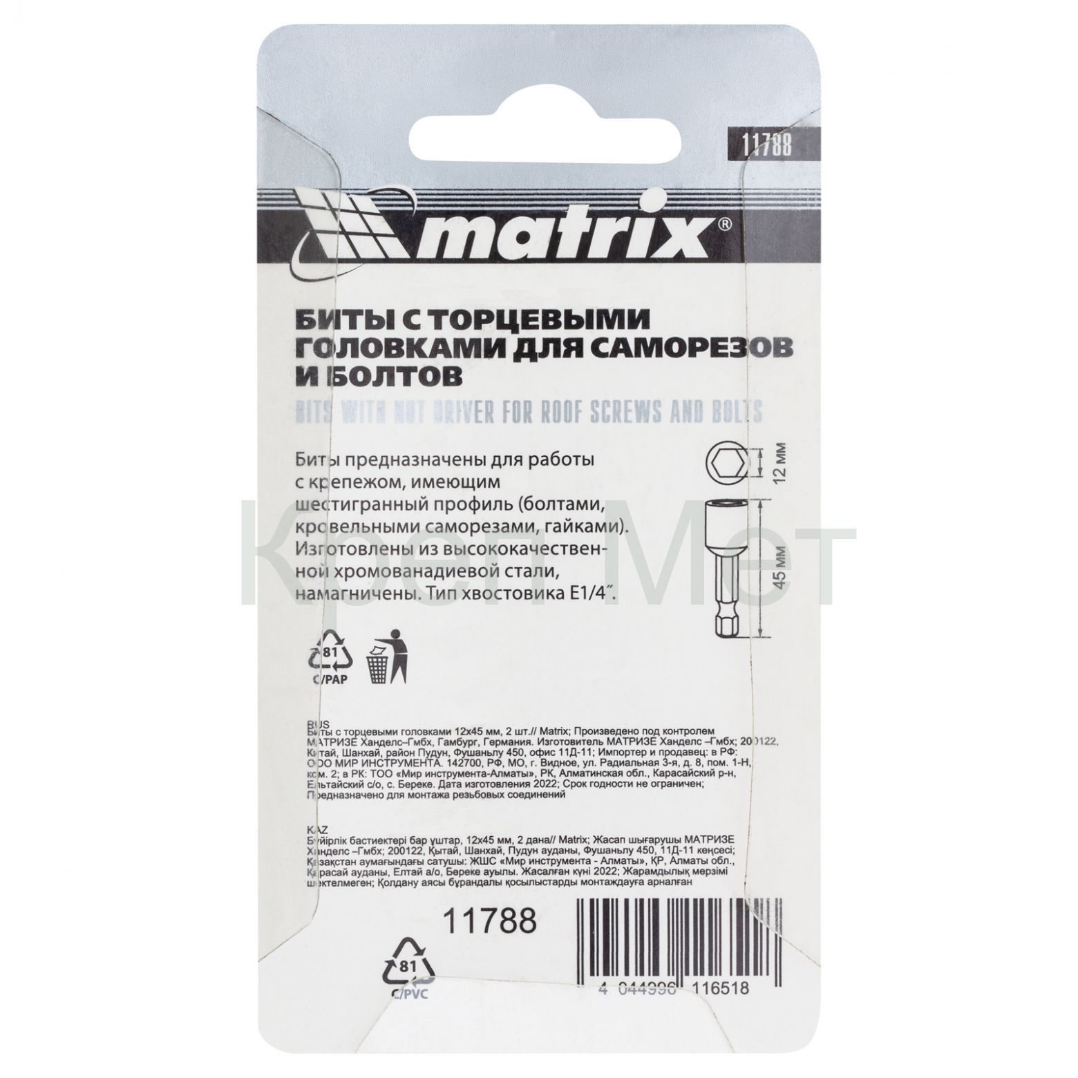 - Биты с торцевыми головками 12 мм, 45 мм, 2 шт. Matrix
