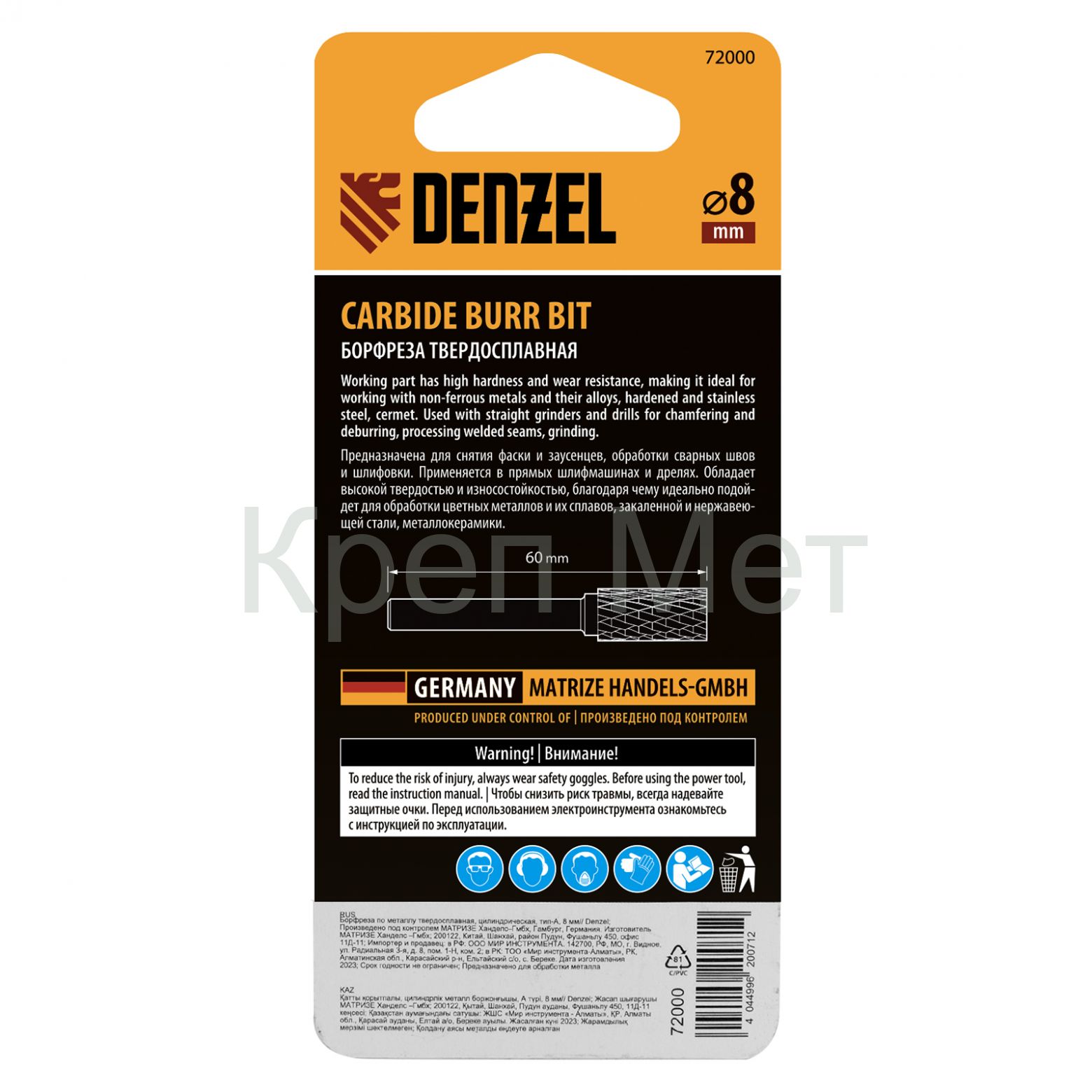 Твердосплавная борфреза Denzel 72000 с цилиндрической рабочей частью (тип A), диаметром 8 мм, используется для работ по металлу (закаленной и нержавеющей стали, латуни, меди, бронзе, чугуну, титану). Подходит также для обработки искусственного камня и металлокерамики. Предназначена для завершающей обработки и подгонки форм и поверхностей: шлифовки, зачистки сварных швов, удаления заусенцев, снятия фасок, разделки кромок. Оснастка устанавливается на прямошлифовальную машину или дрель.