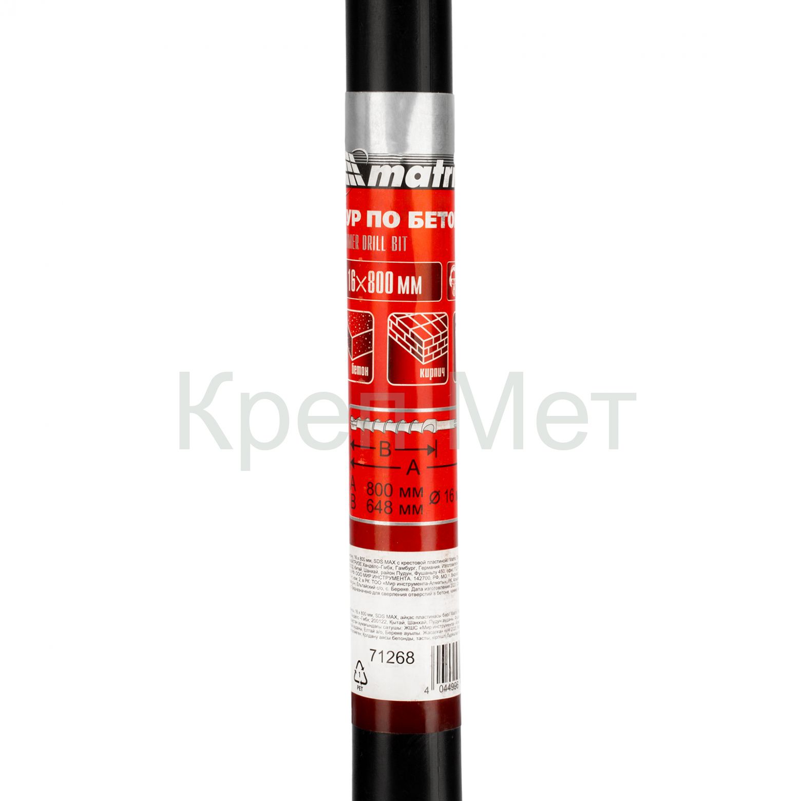 Бур по бетону Matrix 71268 размером 16 х 800 мм используется в качестве оснастки на тяжелых перфораторах с хвостовиком SDS MAX. Подходит для сверления глубоких отверстий в кирпиче и особо прочных материалах: армированном бетоне, природном и искусственном камне.