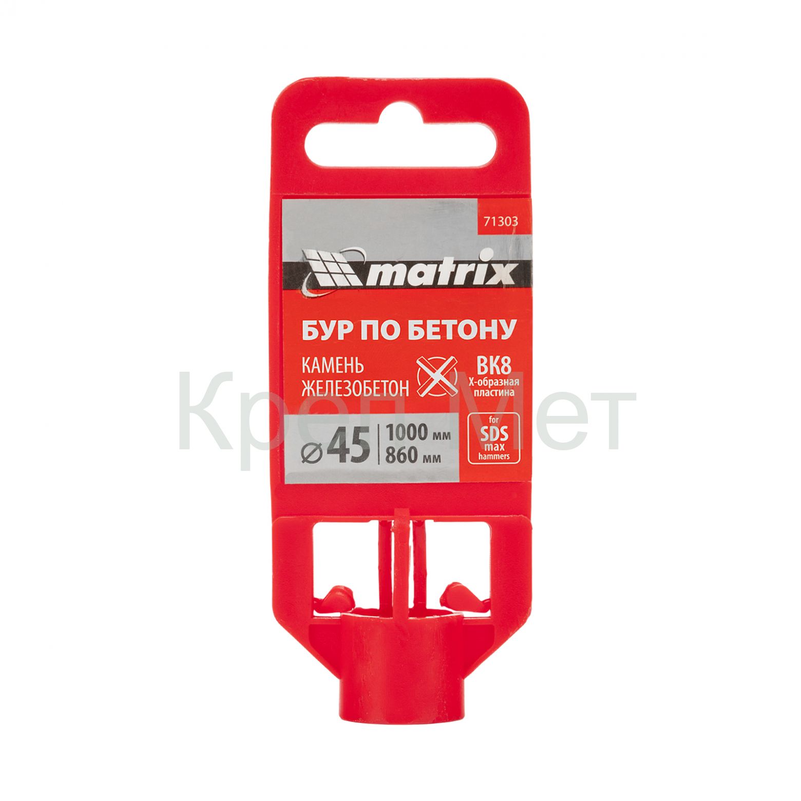 Бур по бетону Matrix 71303 длиной 1000 мм, с хвостовиком SDS MAX и крестовой пластиной, — оснастка для перфораторов высокой мощности, предназначенная для получения отверстий диаметром 45 мм в стенах, полах, перекрытиях. Крестовая пластина в сочетании с усиленной системой крепления SDS MAX позволяет успешно работать с камнем, кирпичом и бетоном, в том числе армированным. Бур используется во время проведения строительных работ, незаменим для прокладки коммуникаций: газо- и водопроводов, электросетей и т.д.