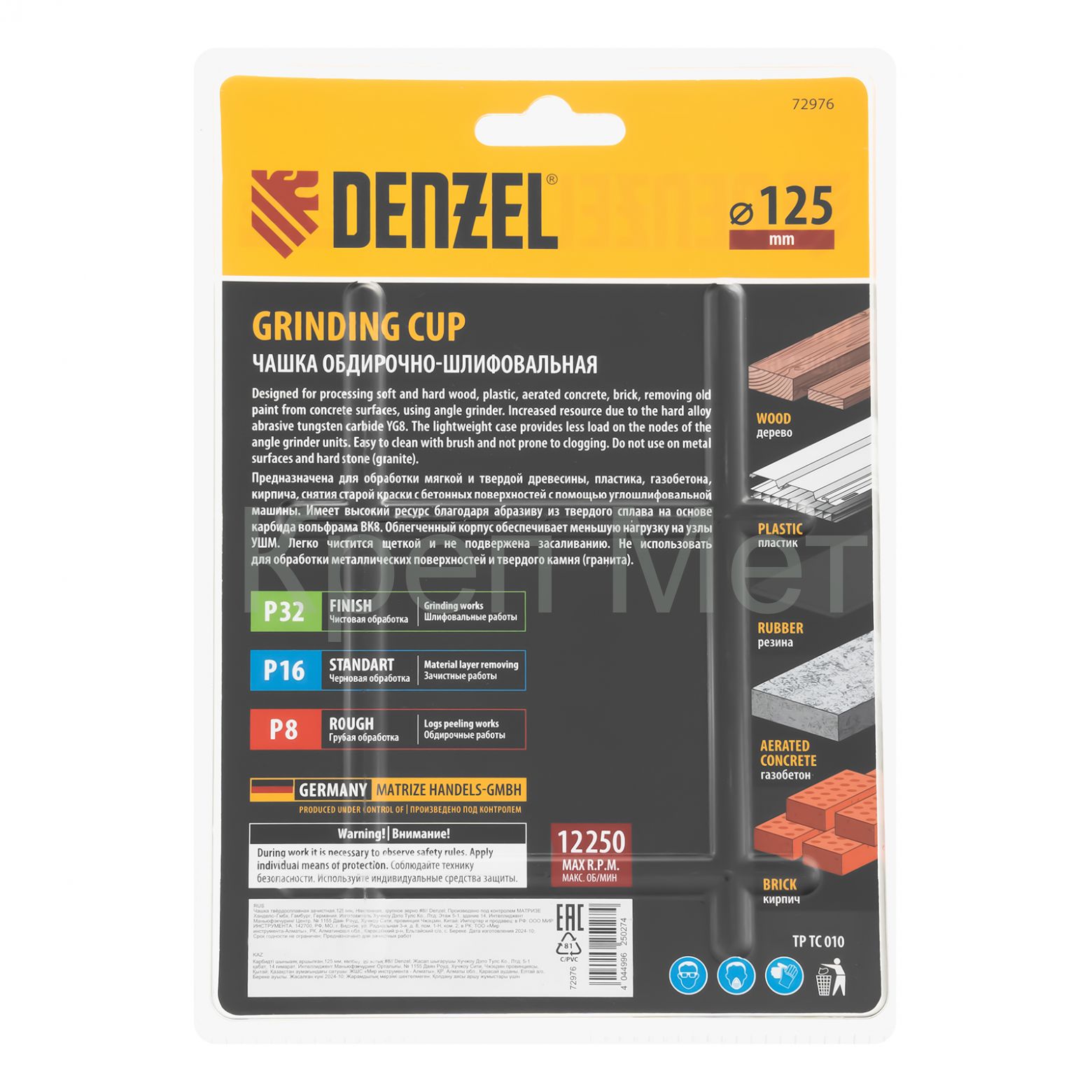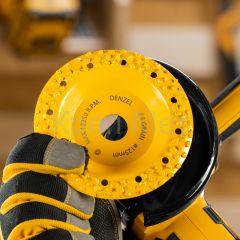 Твердосплавная зачистная чашка Denzel 72976 диаметром 125 мм, с крупным зерном P8 и наклонной рабочей частью, устанавливается на углошлифовальную машину (УШМ) и используется для грубой обработки деревянных, пластиковых, резиновых, газобетонных и кирпичных поверхностей. Позволяет устранить неровности, снять слой старой краски, клея, цемента. В ходе обдирочных работ не образуется абразивная пыль, что снижает вредное воздействие на здоровье пользователя. Наклонная рабочая часть упрощает обработку деталей сложной формы. Облегченный корпус позволяет избежать излишней нагрузки на УШМ и преждевременного выхода инструмента из строя.