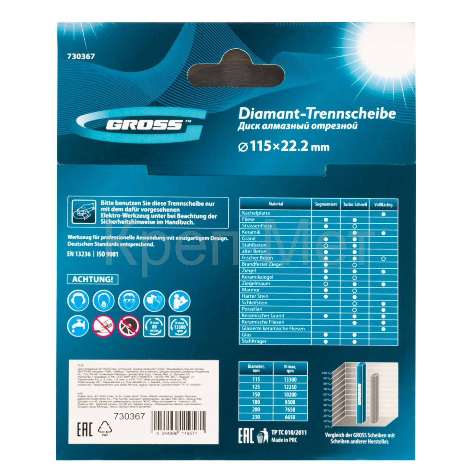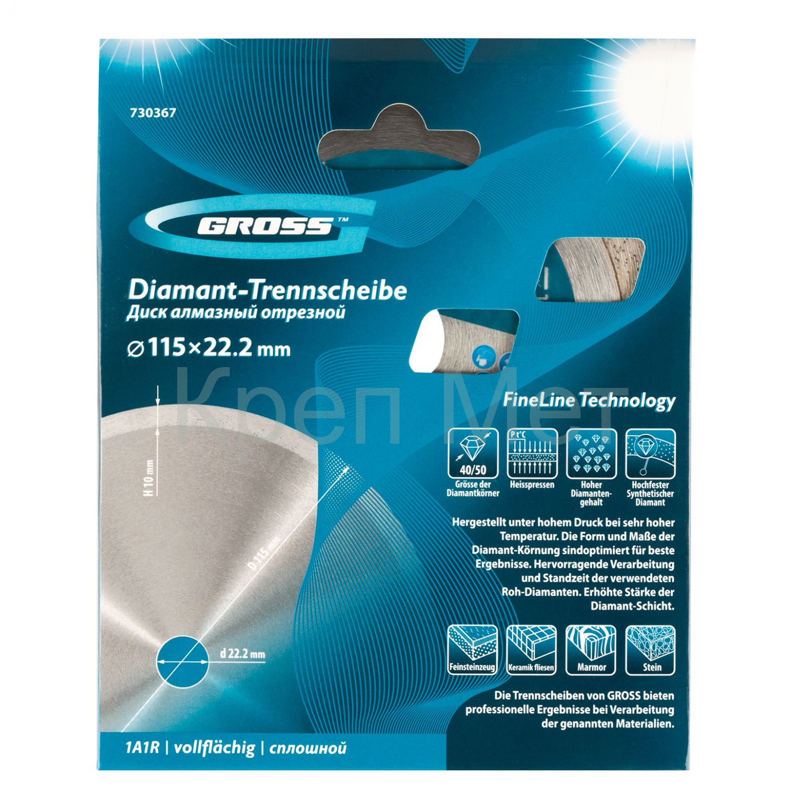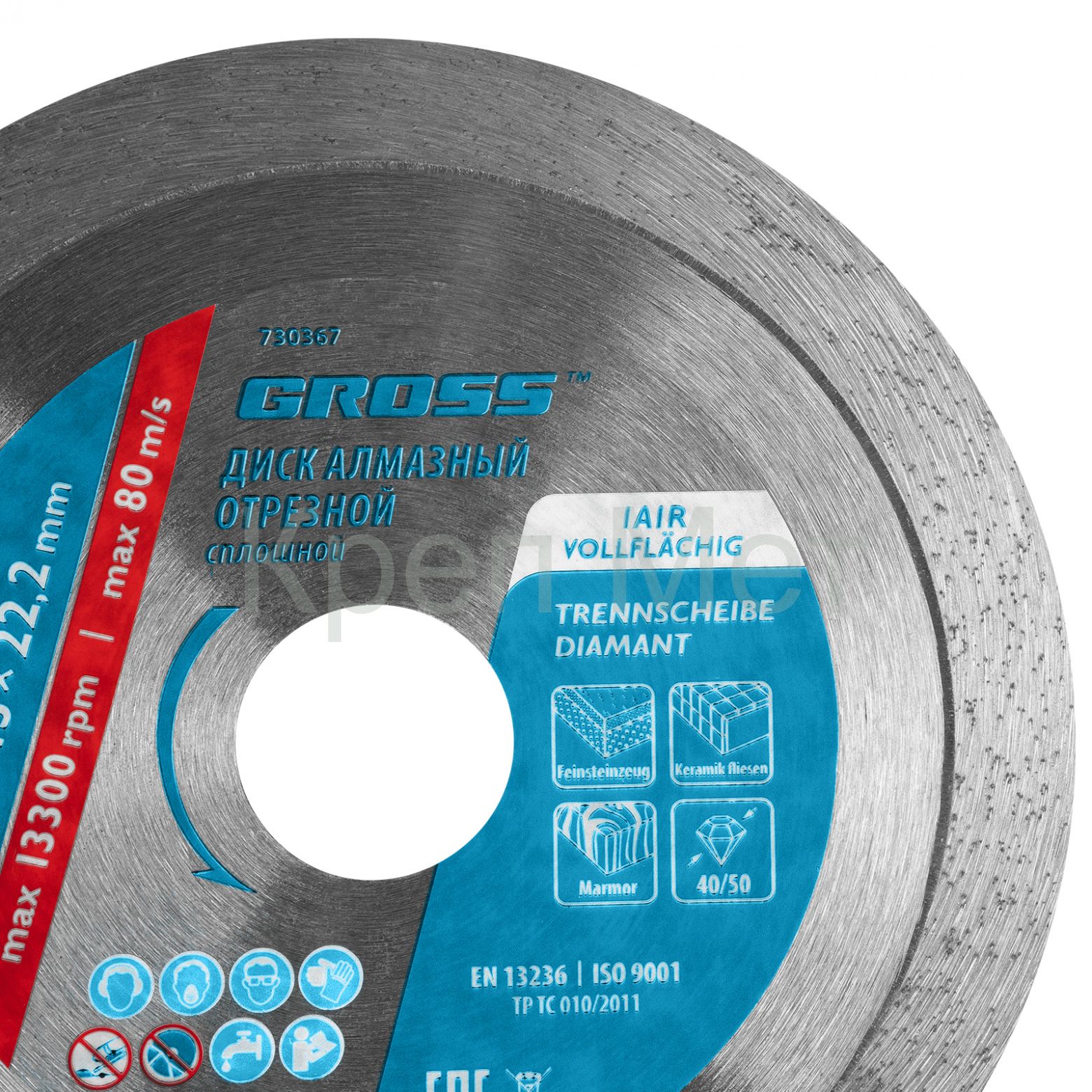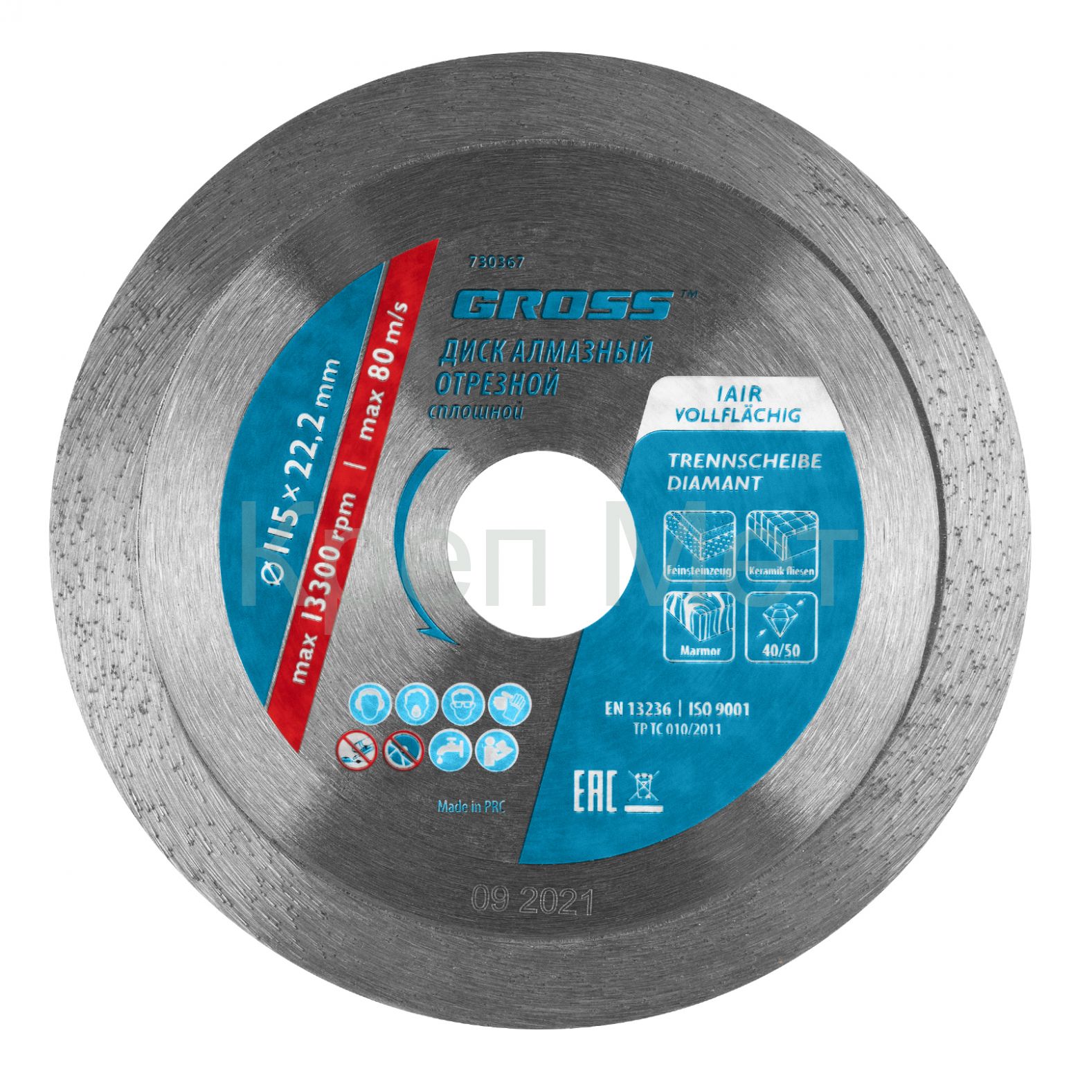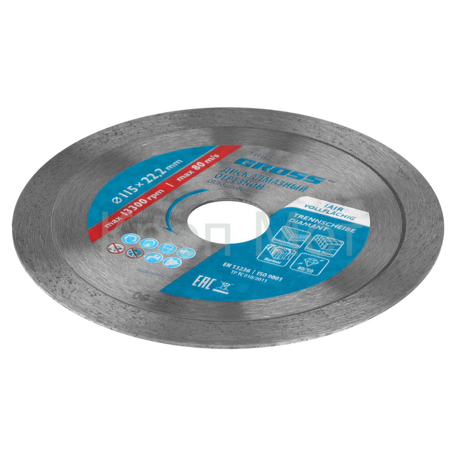 - Диск алмазный, 115 х 22.2 мм, сплошной, мокрая резка Gross