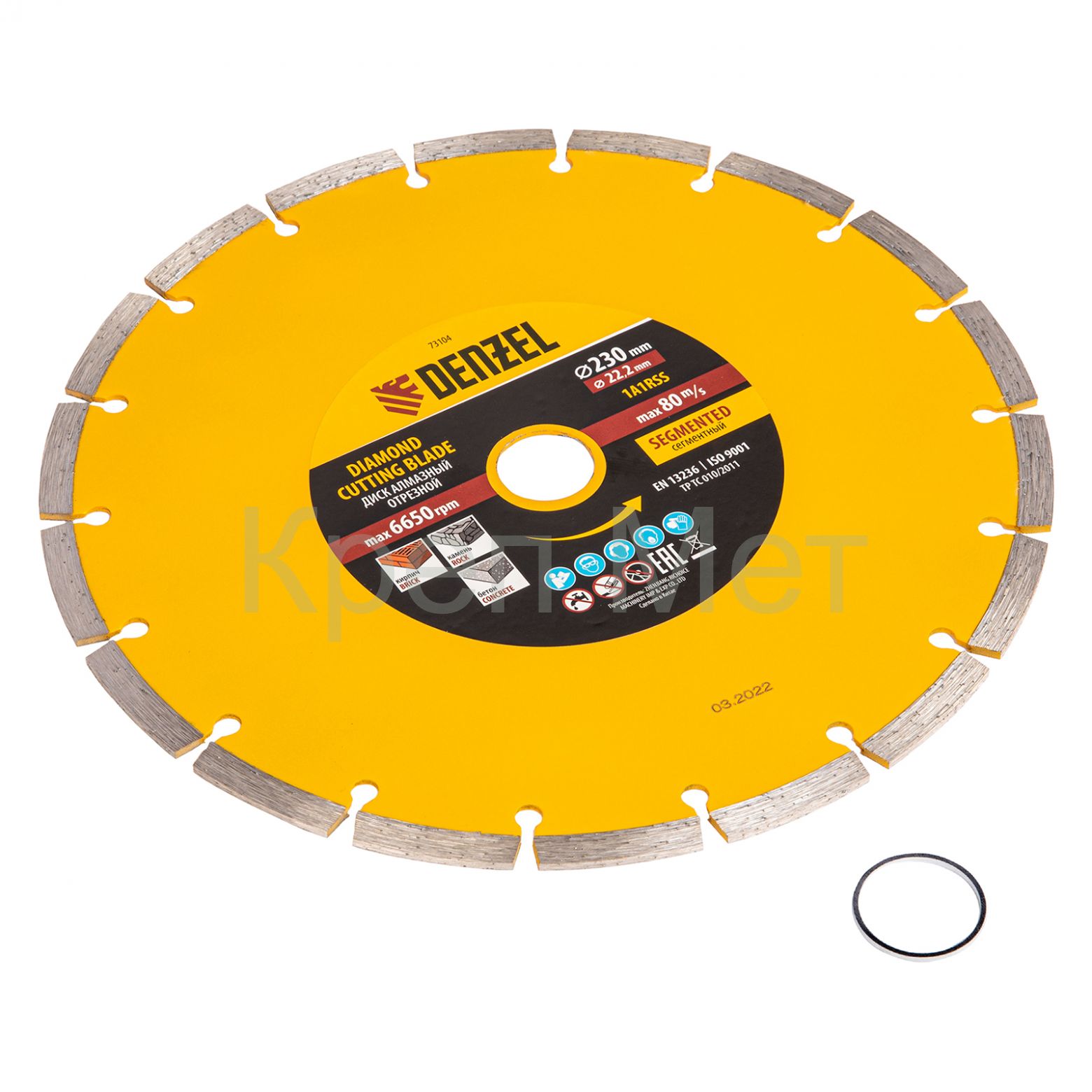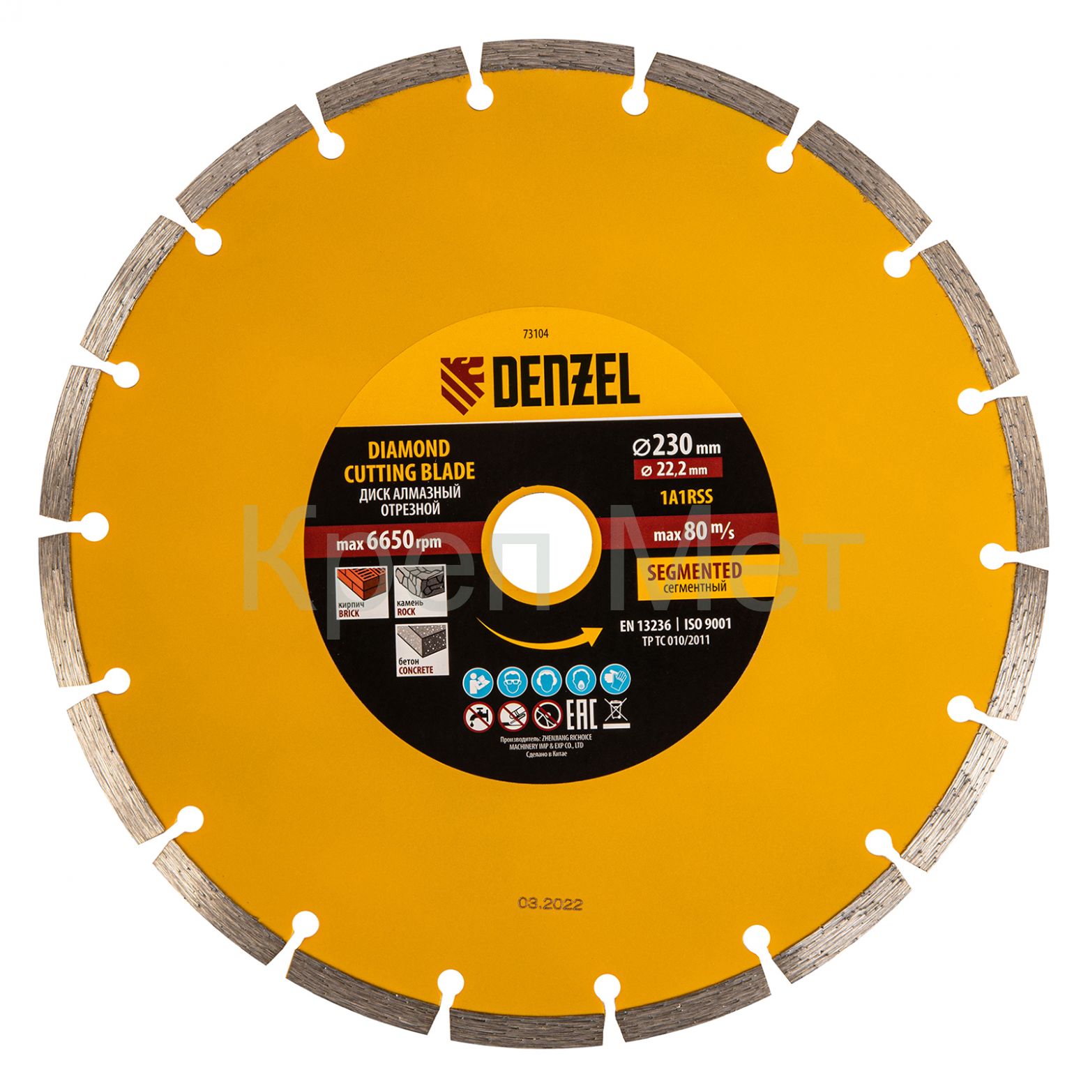 Отрезной сегментный алмазный диск Denzel 73104 диаметром 230 х 22,2 мм — оснастка для УШМ, использующаяся для сухой резки свежего и старого бетона, камня, кирпича, шлакоблока, мрамора, тротуарной плитки, гранита. Диск сегментного типа отличается высокой производительностью даже при интенсивных нагрузках. Подходит для бытового и профессионального использования.