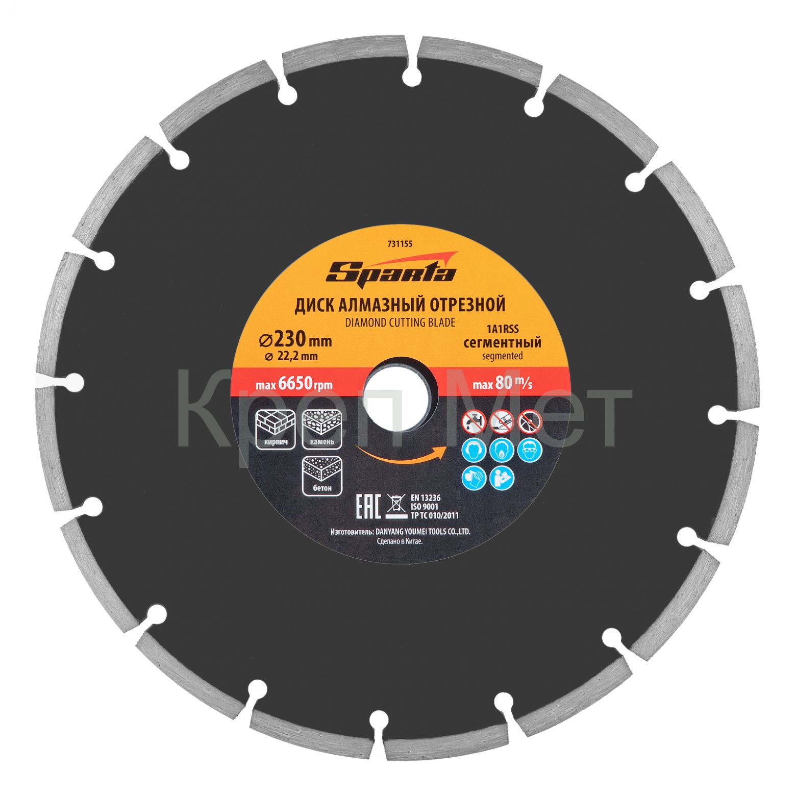 Сегментный отрезной алмазный диск Sparta 731155 диаметром 230 х 22,2 мм применяется для сухой резки бетона, камня, шлакоблока, тротуарной плитки и кирпича. Устанавливается на углошлифовальную машину с посадочным диаметром 22,2 мм. Подходит для интенсивной работы, оптимален для решения бытовых задач.