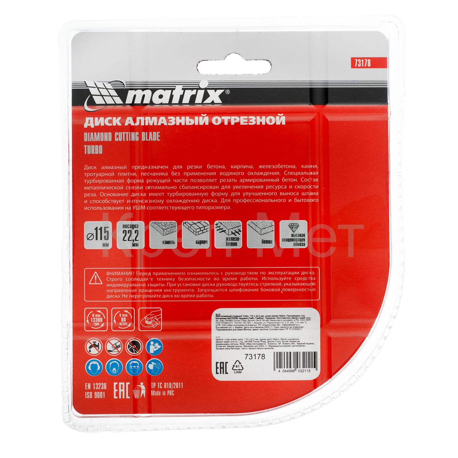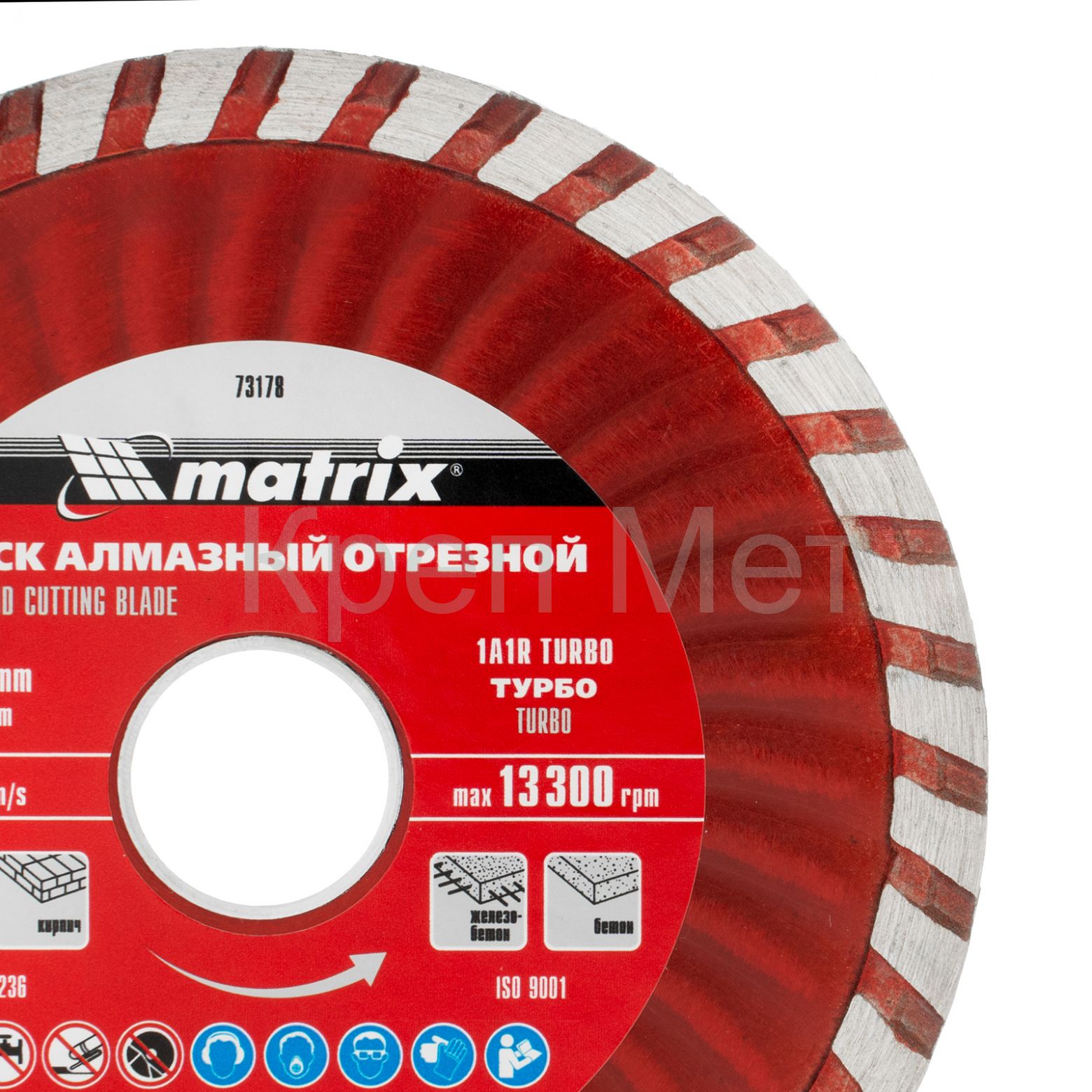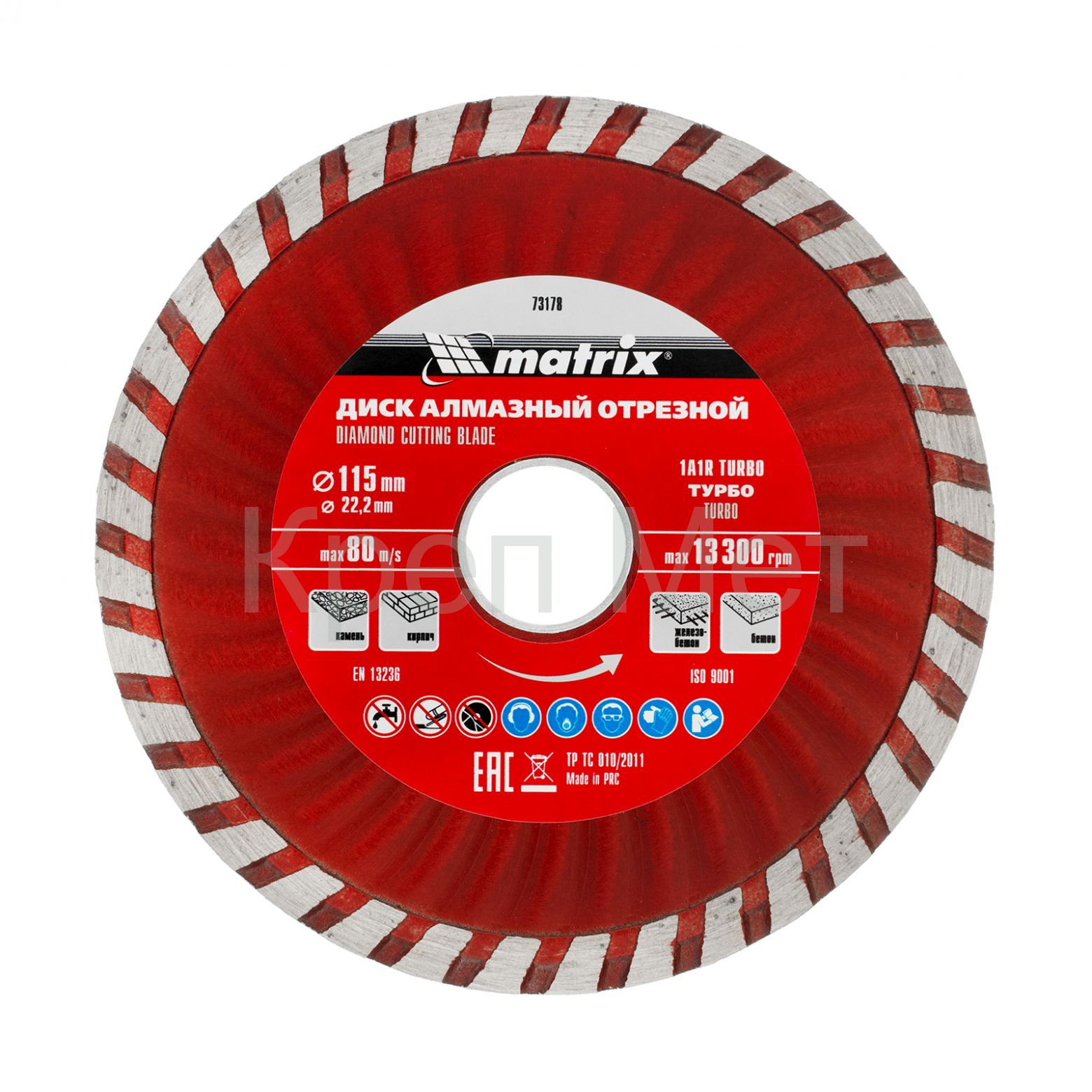 Отрезной алмазный диск Matrix Turbo 73178 диаметром 115 х 22,2 мм, предназначен для сухой резки. Используется в качестве сменной оснасткой для углошлифовальных машин (УШМ) во время ремонта и мелкого строительства, а также в быту. Позволяет работать по бетону, в том числе свежему и среднеармированному, камню и кирпичу.