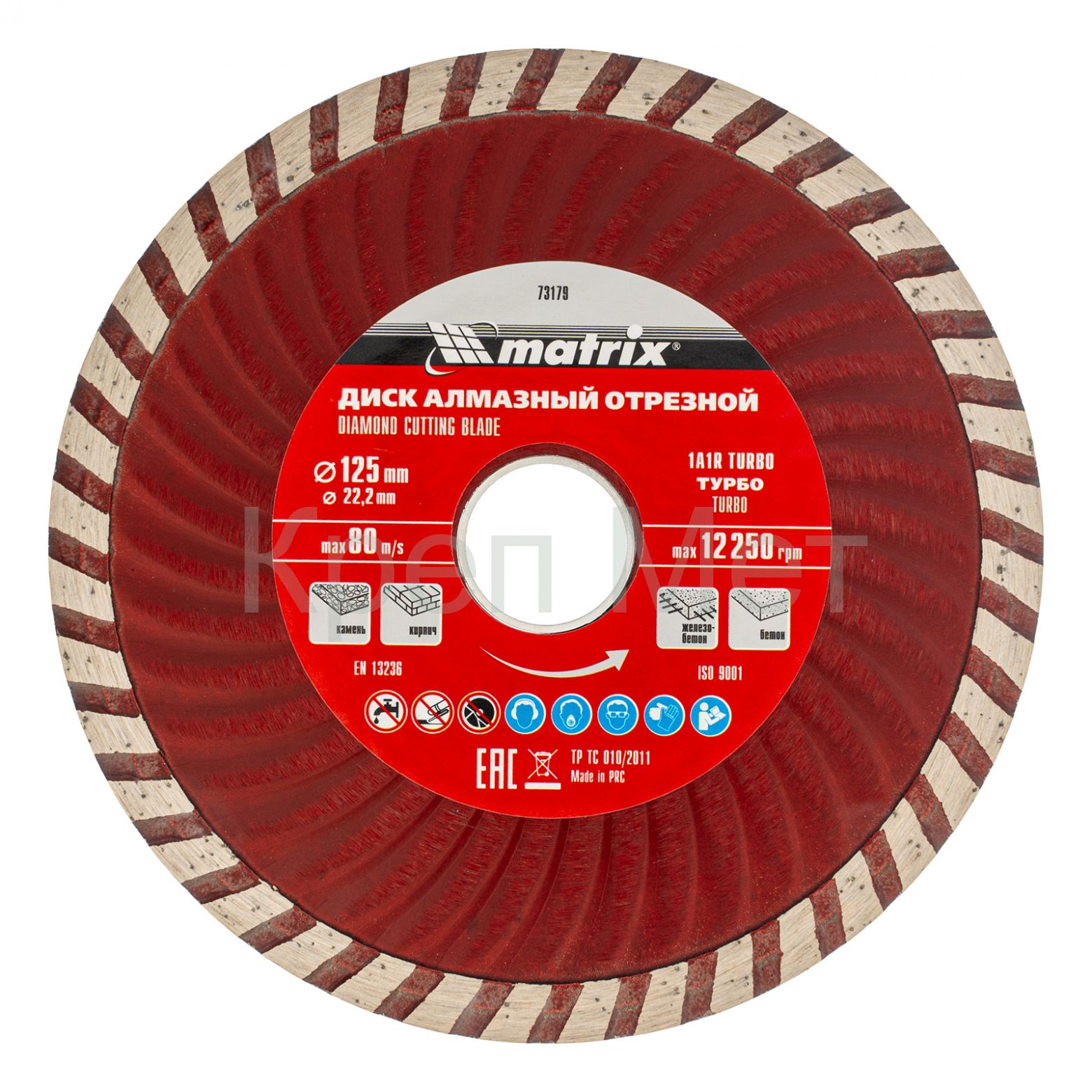 Отрезной алмазный диск Matrix Turbo 73179 диаметром 125 х 22,2 мм, предназначен для сухой резки. Используется в качестве сменной оснасткой для углошлифовальных машин (УШМ) во время ремонта и мелкого строительства, а также в быту. Позволяет работать по бетону, в том числе свежему и среднеармированному, камню и кирпичу.
