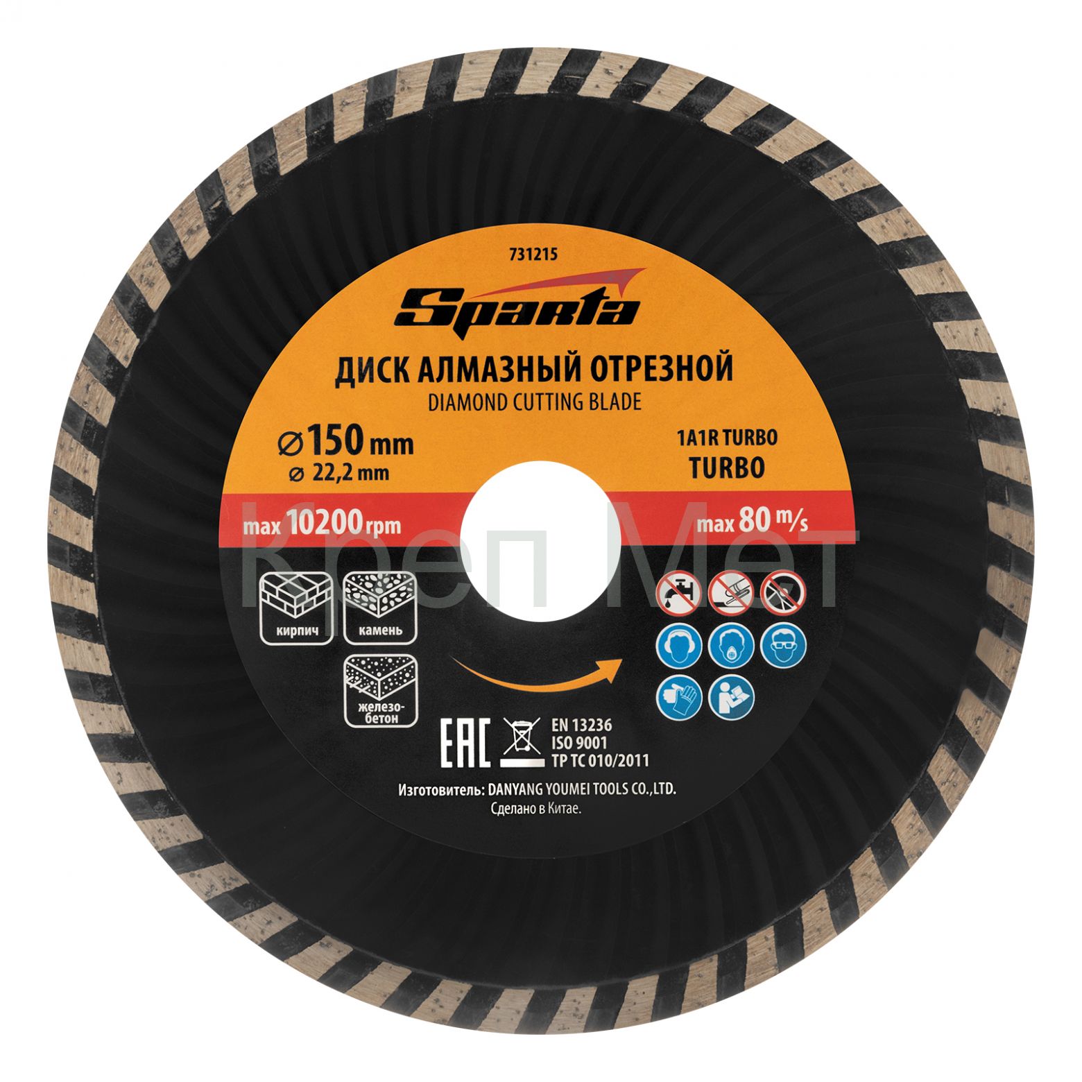 Алмазный отрезной диск Sparta Turbo 731215 для сухой резки, диаметром 150 х 22,2 мм, устанавливается на углошлифовальную машину. Позволяет резать твердые материалы: бетон, железобетон, камень, песчаник. Диск предназначен для бытового использования.