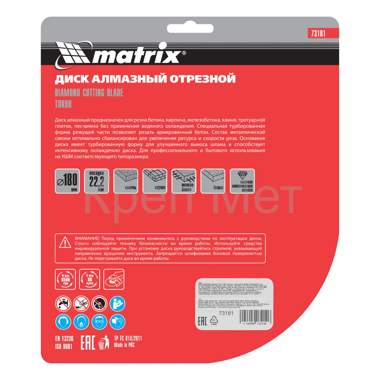 Отрезной алмазный диск Matrix Turbo 73181 диаметром 180 х 22,2 мм, предназначен для сухой резки. Используется в качестве сменной оснасткой для углошлифовальных машин (УШМ) во время ремонта и мелкого строительства, а также в быту. Позволяет работать по бетону, в том числе свежему и среднеармированному, камню и кирпичу.