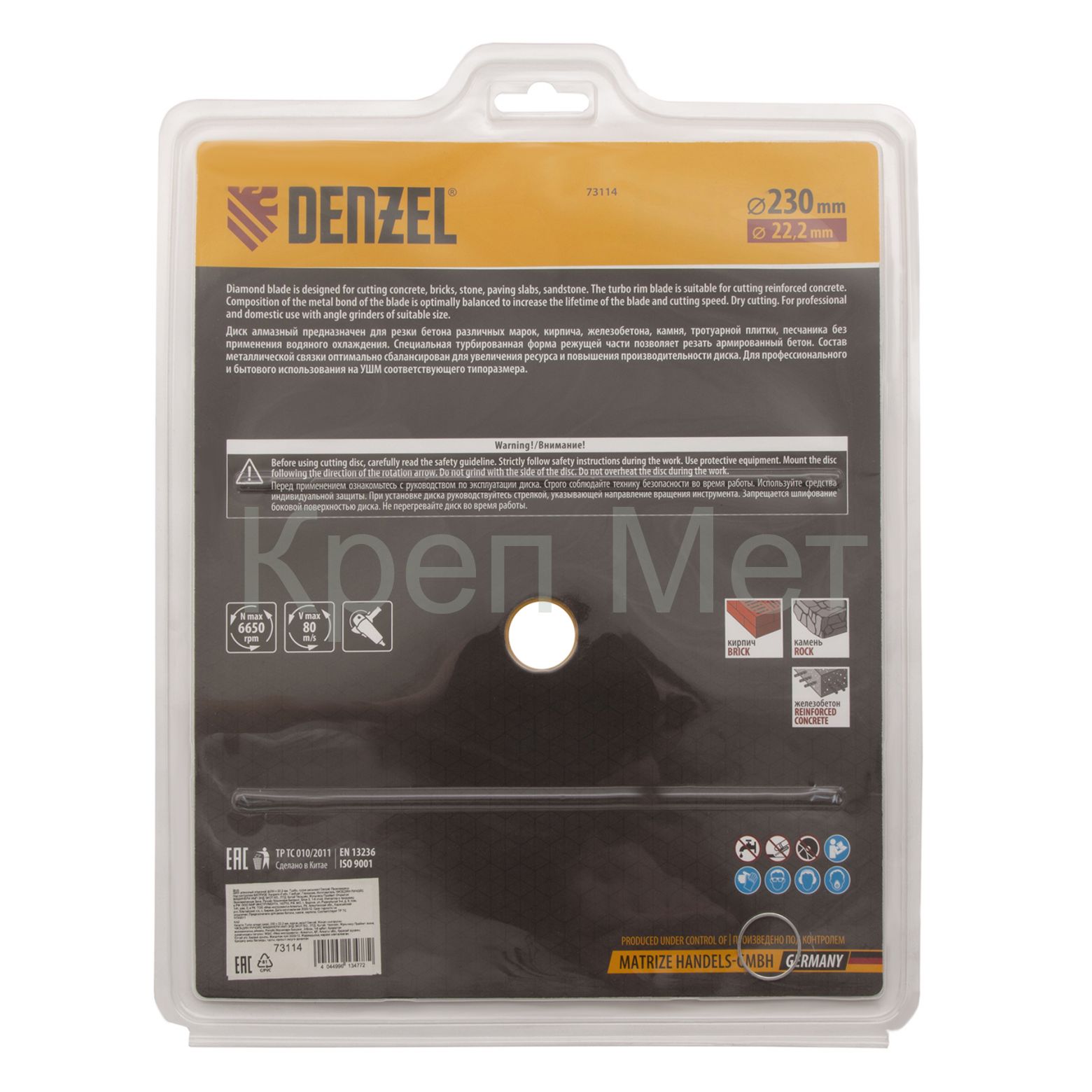 Отрезной алмазный диск Denzel Turbo 73114 диаметром 230 х 22,2 мм используется для сухой резки камня, кирпича, свежего и затвердевшего бетона, железобетона. Благодаря специальной форме испытывает уменьшенную нагрузку при резании материалов. Устанавливается на УШМ и применяется для проведения бытовых и профессиональных отрезных работ.