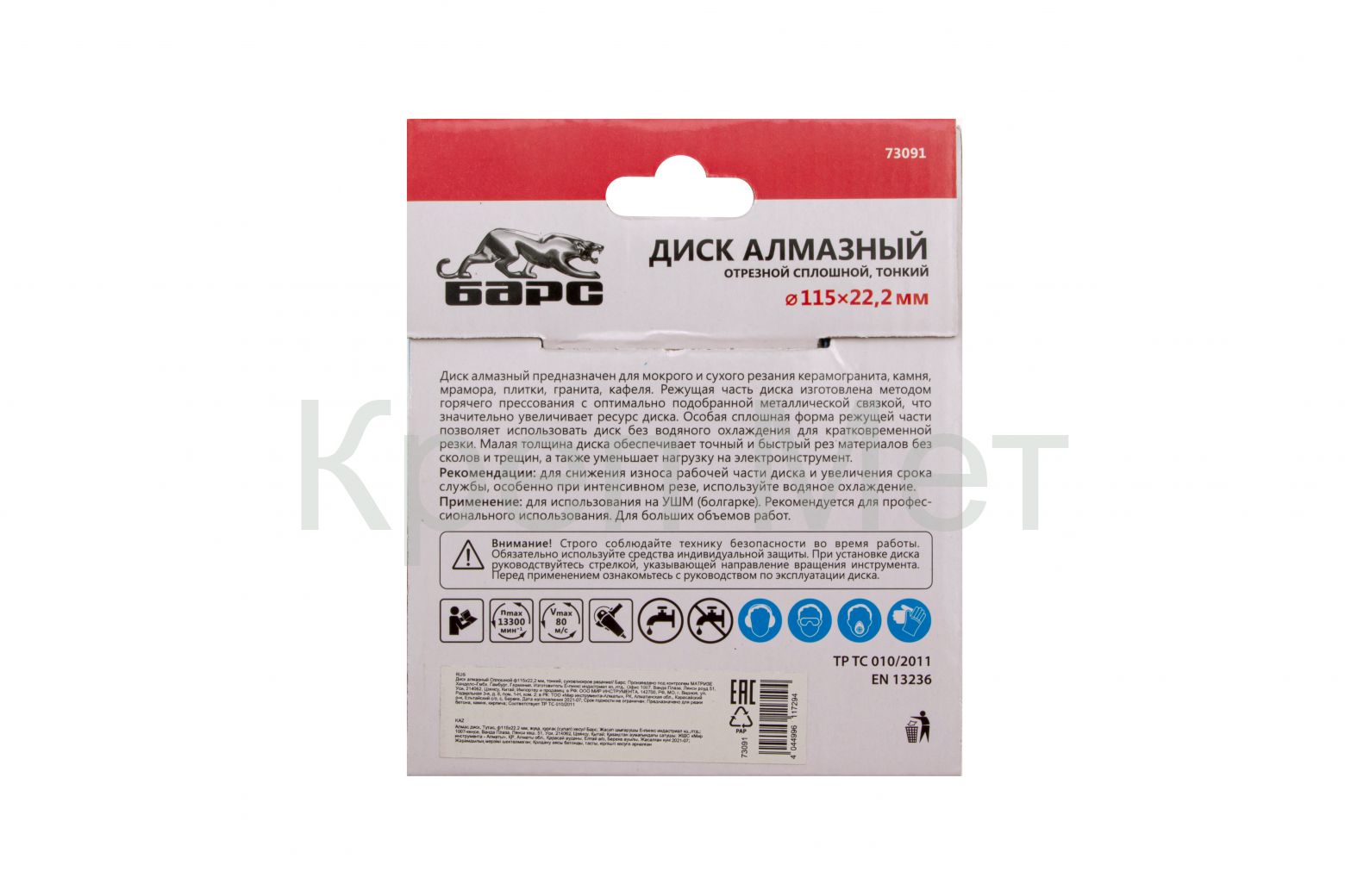 - Диск алмазный, сплошной 115 х 22.2 мм, тонкий, сухая/мокрая резка Барс