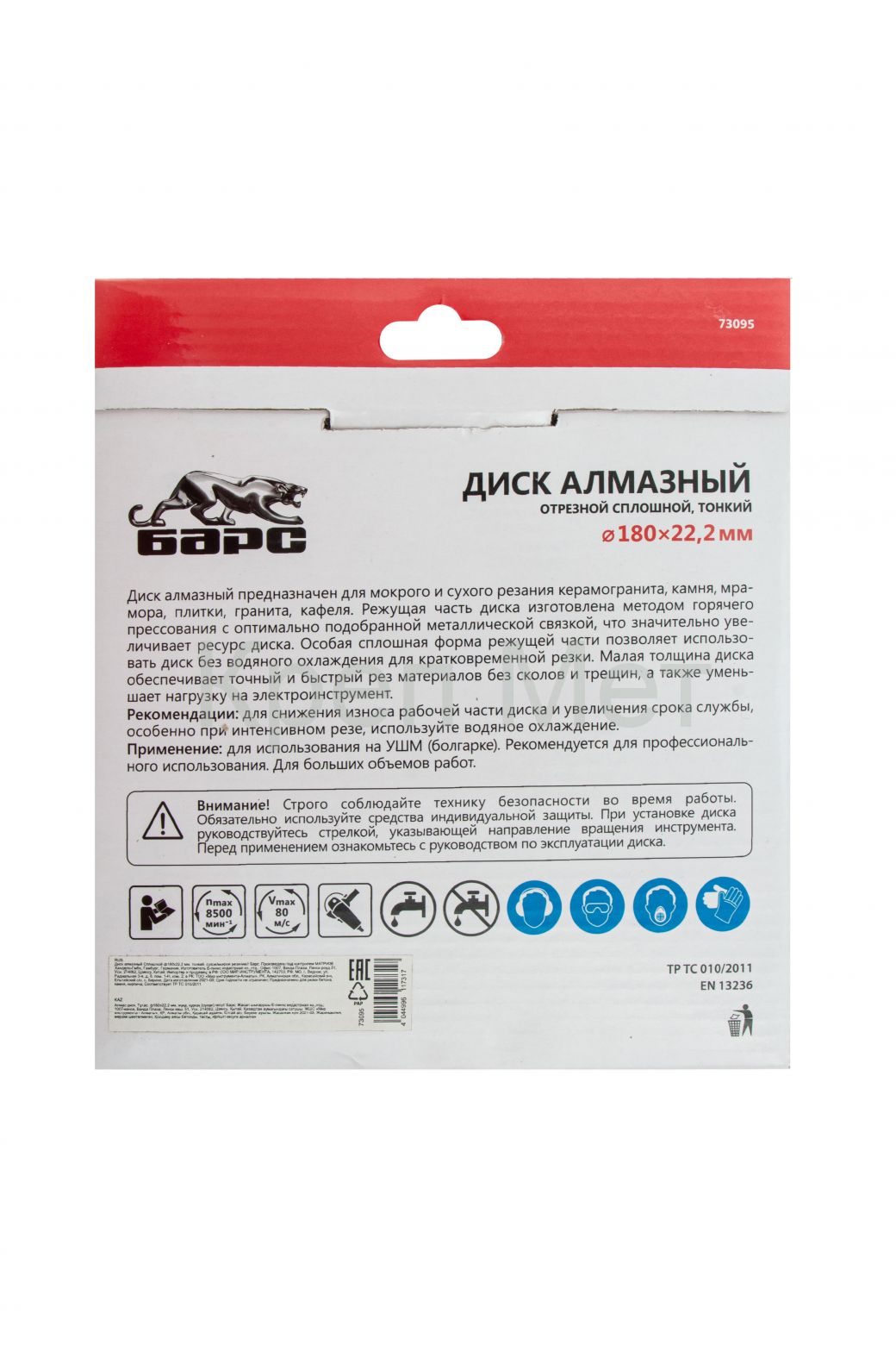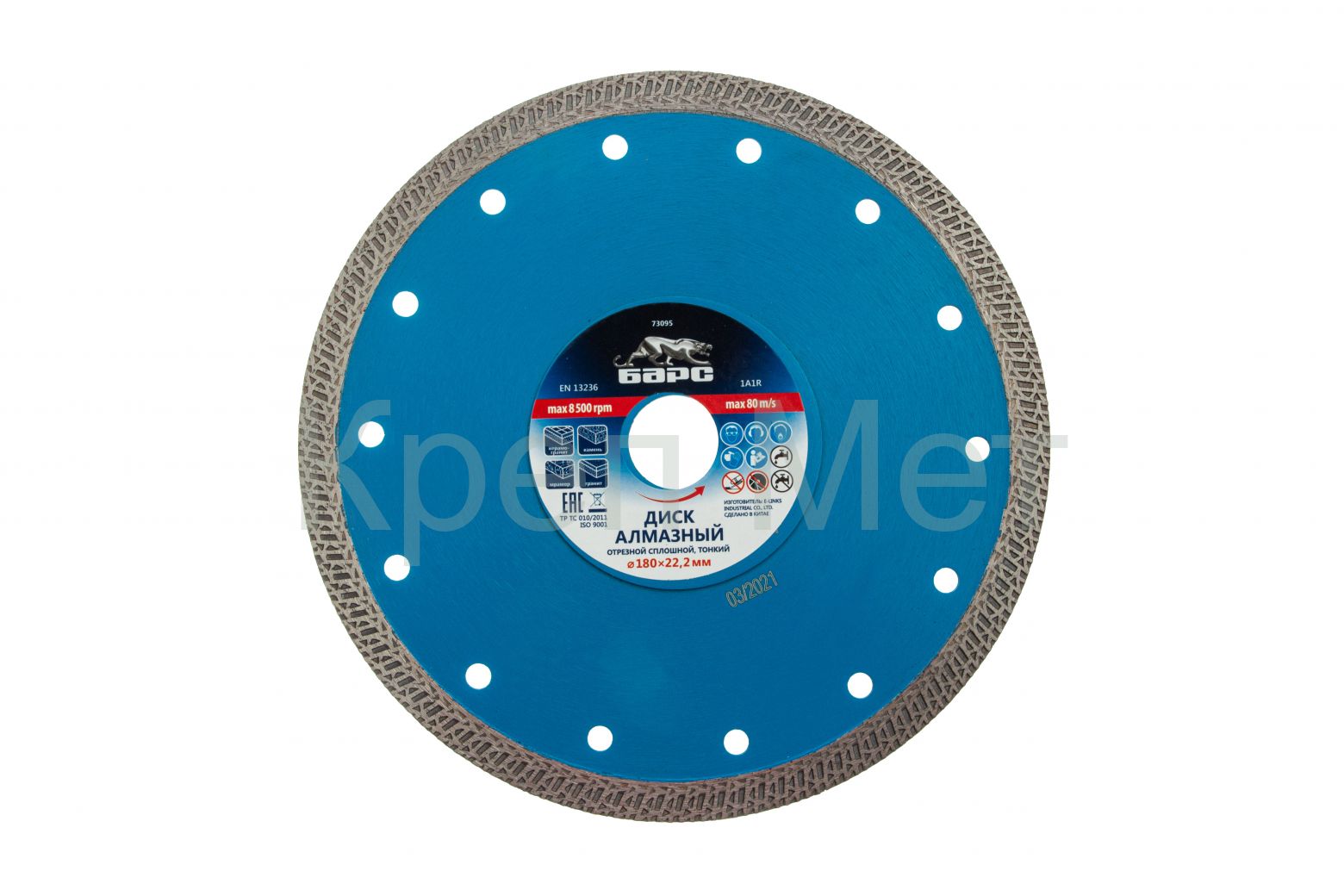 - Диск алмазный, сплошной 180 х 22.2 мм, тонкий, сухая/мокрая резка Барс