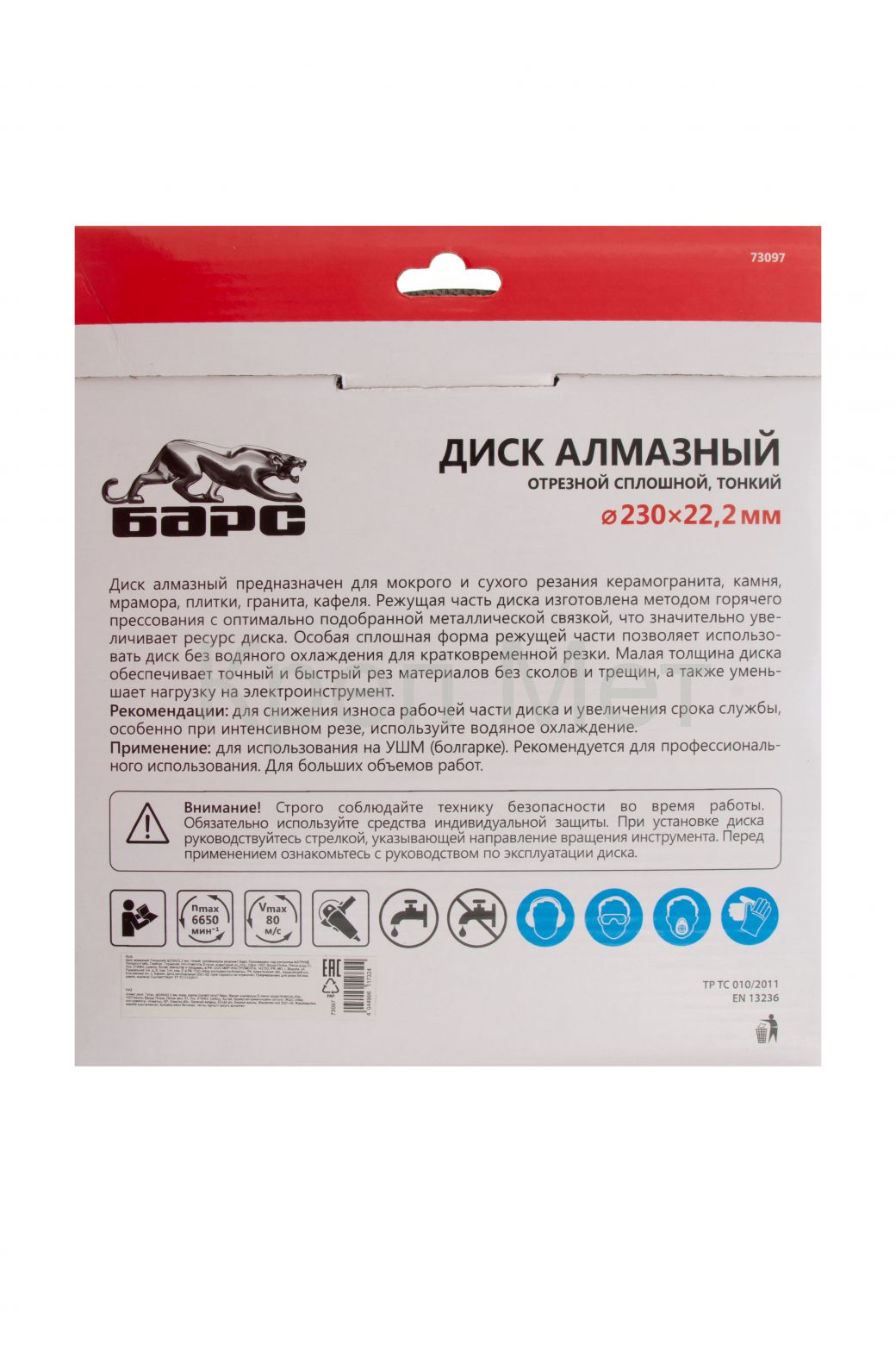 - Диск алмазный, сплошной 230 х 22.2 мм, тонкий, сухая/мокрая резка Барс