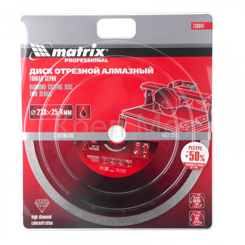Тонкий сплошной алмазный диск Matrix 230 х 25,4 мм 730847 обеспечивает мокрое резание плотных материалов: керамогранита, керамической и кафельной плитки, мрамора, натурального и искусственного камня. Он устанавливается на УШМ или плиткорезы и используется с применением водяного охлаждения. Диск увеличивает производительность на 20% благодаря небольшой толщине 2,1 мм и снижению нагрузки на инструмент.