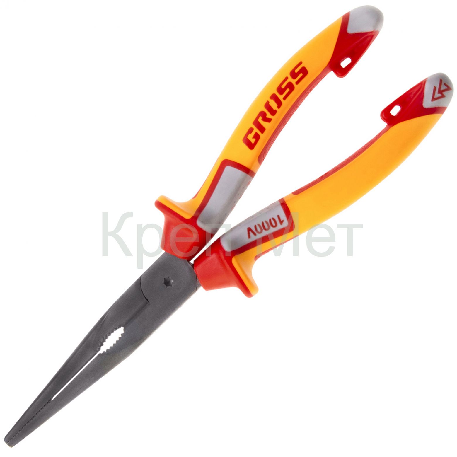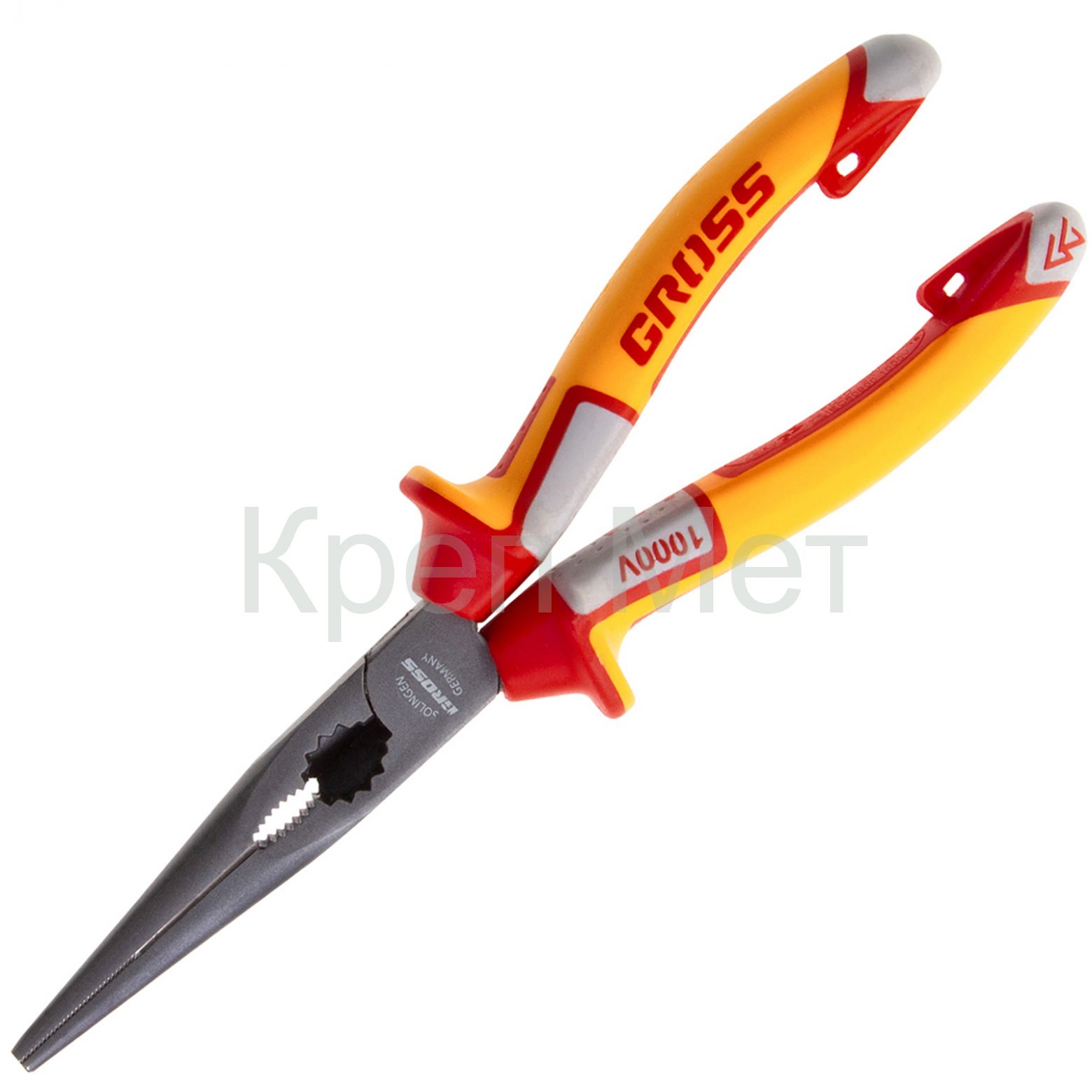 - Длинногубцы прямые, диэлектрические рукоятки до 1000 В, трехкомпонентные рукоятки, 205 мм Gross