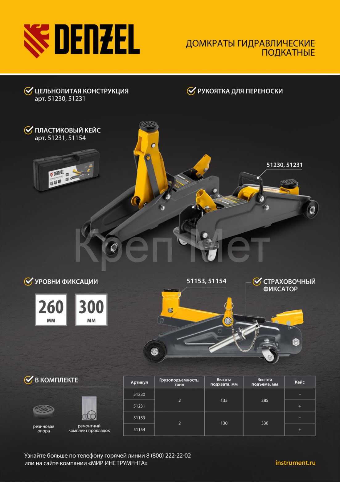 Гидравлический подкатной домкрат Denzel 51230 с высотой подхвата 135 мм предназначен для плавного подъема грузов массой до 2 т на высоту до 385 мм. Домкрат пригодится владельцам легковых автомобилей со стандартным клиренсом.