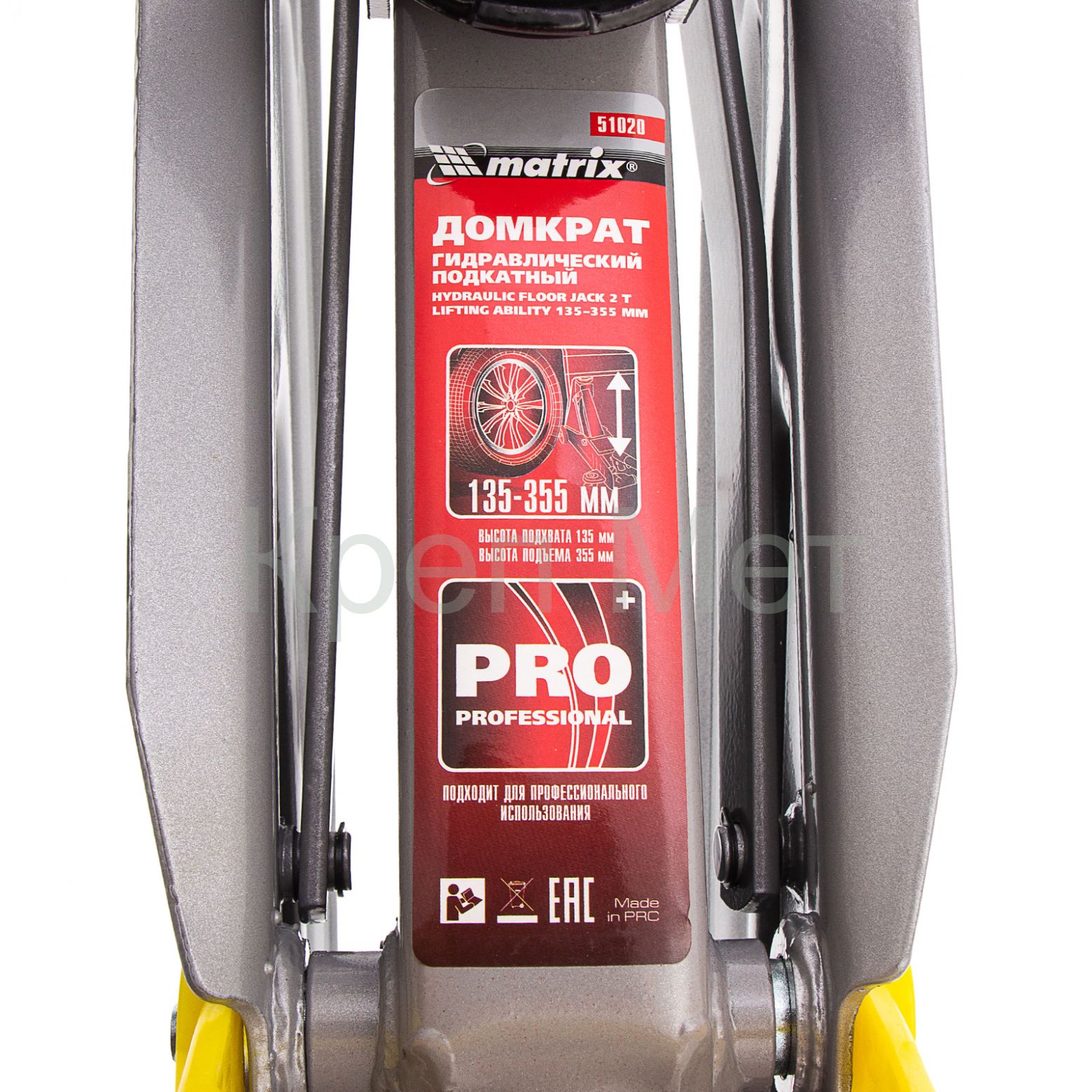 Подкатной гидравлический домкрат Matrix 51020 с высотой подхвата 135 мм, — полупрофессиональное гаражное оборудование, способное поднимать груз массой до 2 т на высоту до 355 мм. Высота подхвата 135 мм позволяет использовать домкрат для автомашин со стандартным клиренсом. Домкрат будет полезен как в автомастерской, так и в частном гараже.