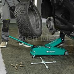 - Маневренность — благодаря поворотным колесам домкрат можно быстро подвести под груз.