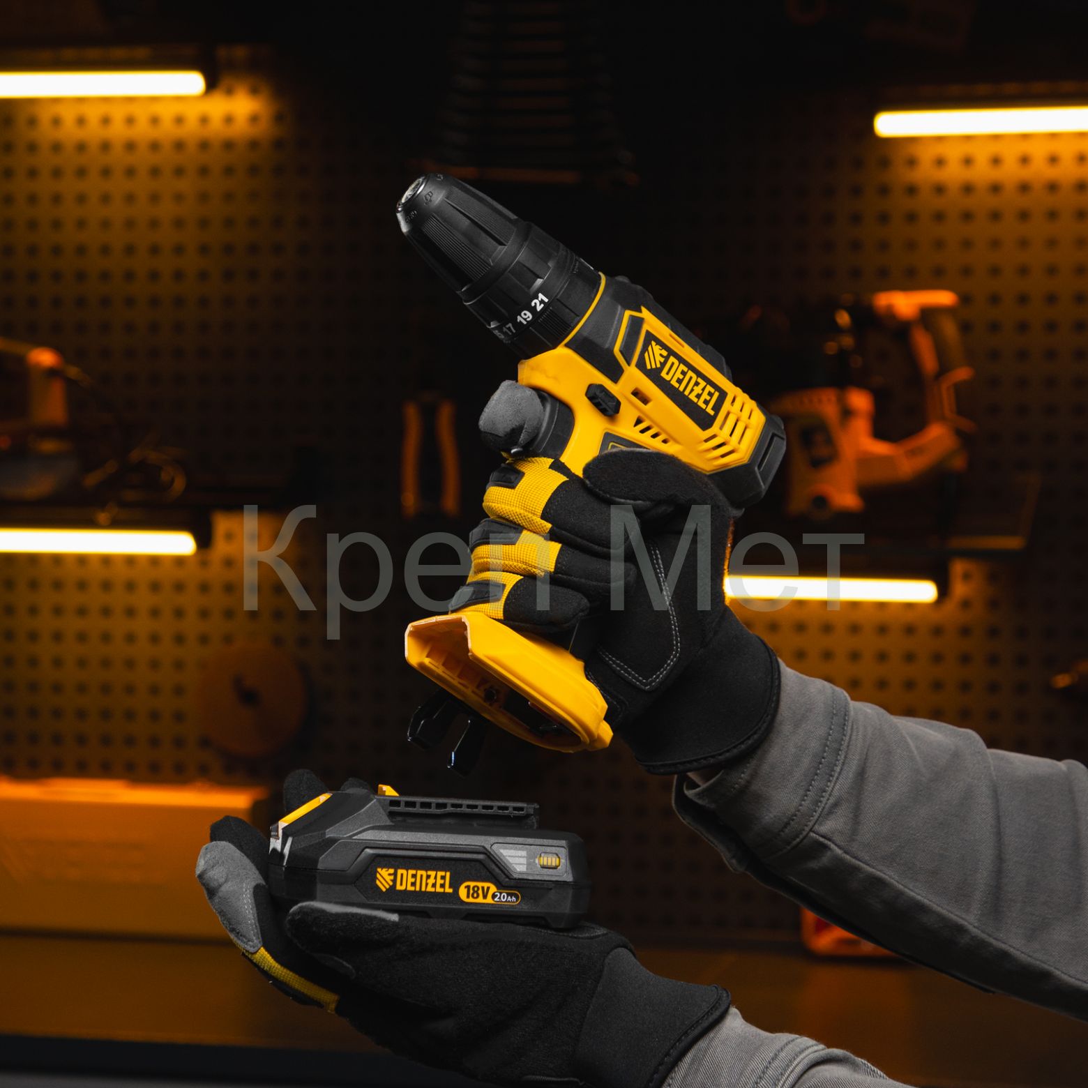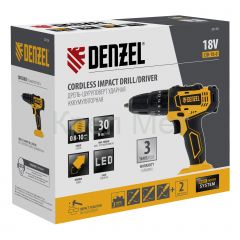 - Универсальность — дрель-шуруповерт совместима с любым Li-Ion аккумулятором и зарядным устройством единой платформы Denzel Battery System 18V.