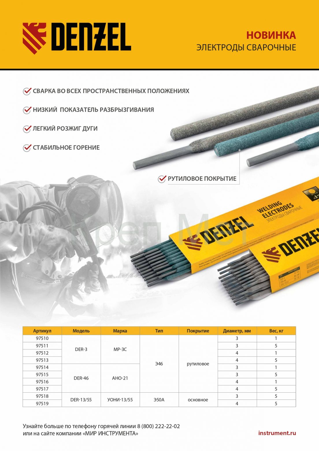 Электроды DER-3, диам. 3 мм, 5 кг, рутиловое покрытие Denzel